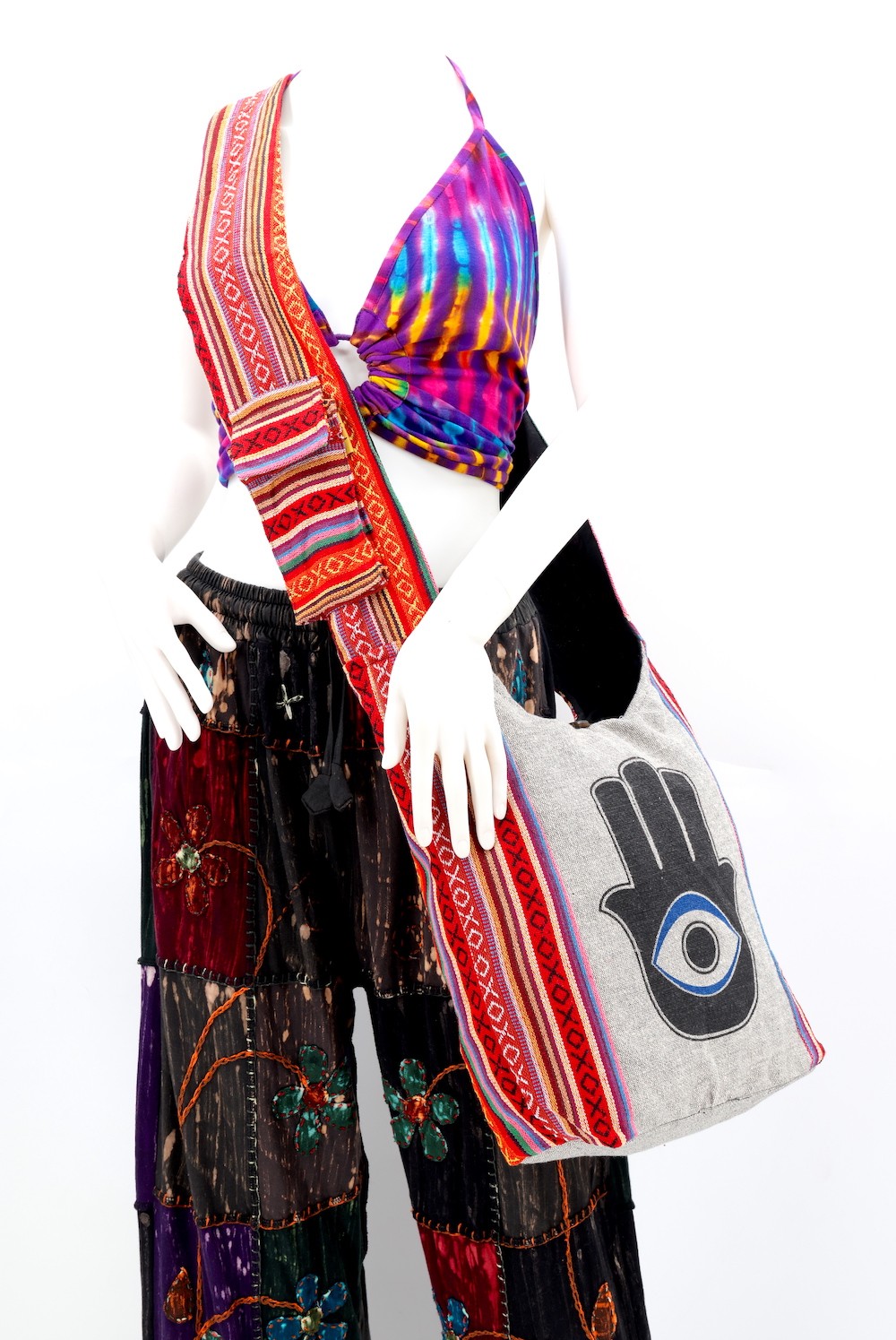 A versatile and beautiful Hamsa Evil Eye Print Handmade Cotton Crossbody Bag made with 100 percent natural handwoven cotton. Stitched and assembled by the most talented artisans in Nepal.