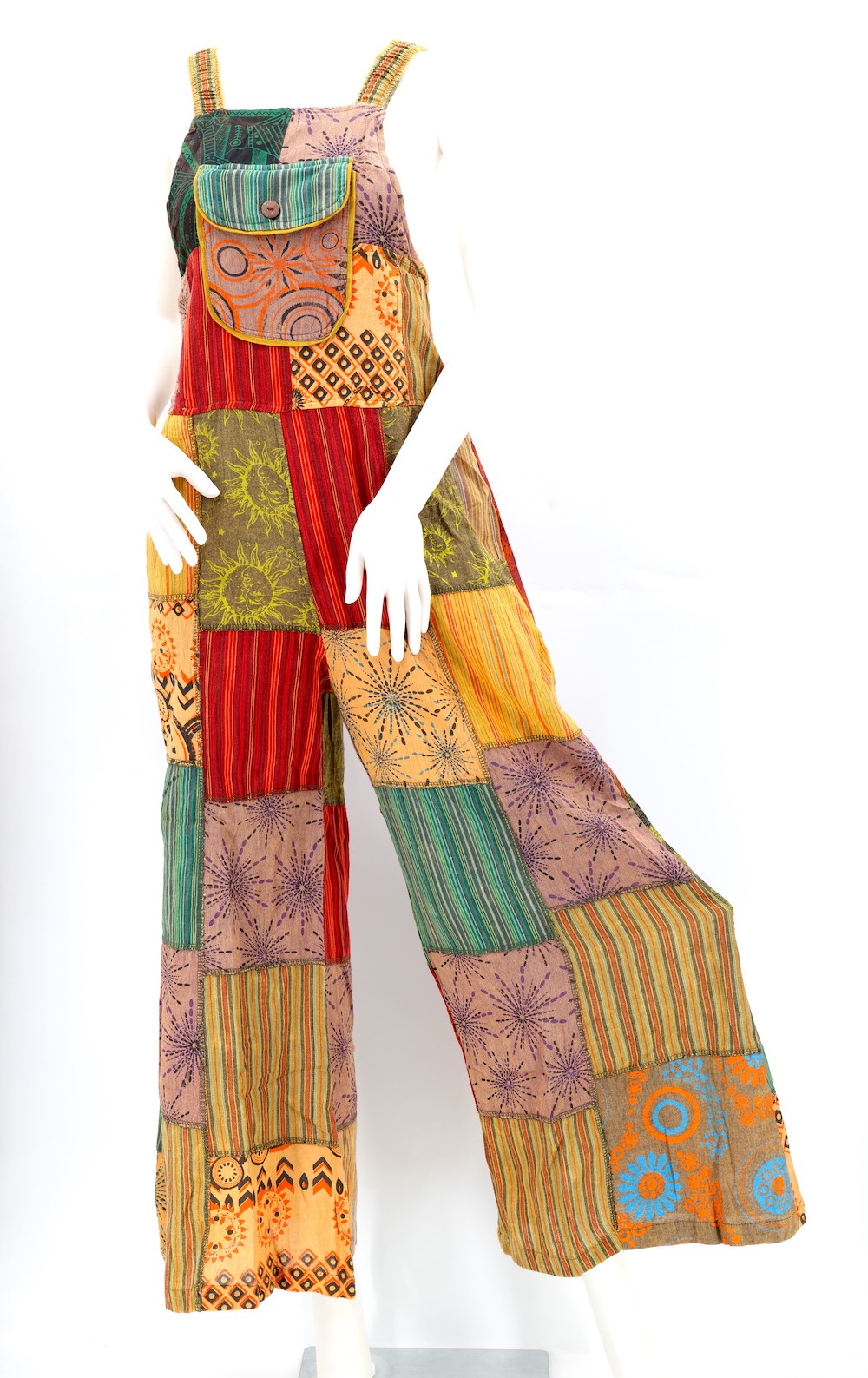 These Unique Hippie Wide Leg Gheri Block Print Multicolor Overlock Patchwork Overalls are crafted from the finest 100% Natural Handwoven Cotton by some of the most skilled artisans. Elevate your style instantly with these extraordinary and highly fashionable Multicolor Patchwork Block Print Overalls that are suitable for almost any occasion, ensuring you look your best every single time.