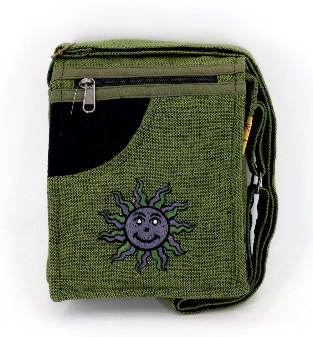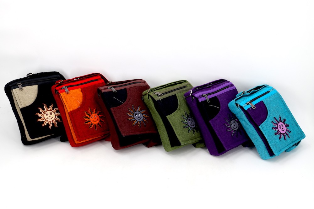The beautiful Hand-Woven Cotton Travel bag is hand made in Nepal with pure 100% organic Himalaya Cotton. This modern Mushroom Embroidery Cotton passport bag is supremely versatile and fashionable. This bag features are it has two compartments with zippers and it has adjustable strap with outside two pockets in the front and in the main pocket above with a zipper. It is a fair trade made product.