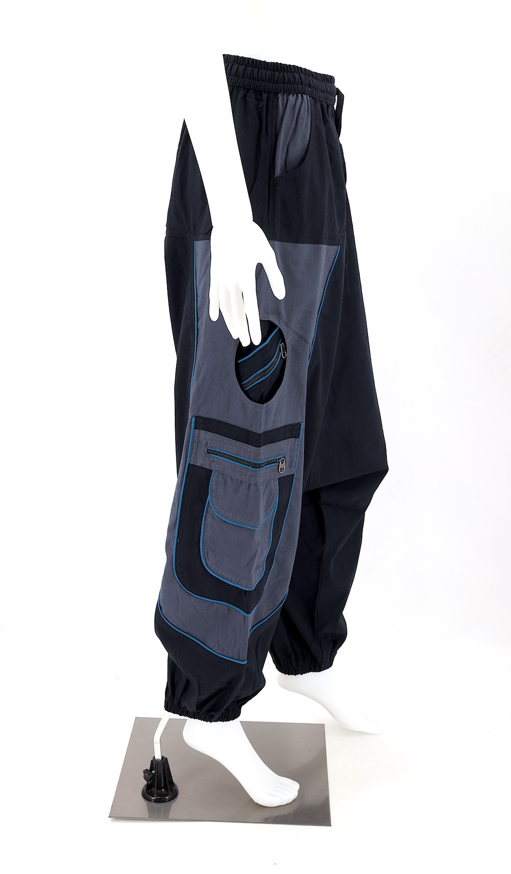 These pants come with an adjustable waist that can be easily tailored to your needs, depending on the size you are wearing. Each side boasts three pockets, featuring a larger pocket with a secure zipper to keep your items and valuables safe, as well as a smaller buttoned pocket for added convenience, in addition to smaller pockets in the hips. There is also a zippered pocket on the left hand side. Additionally, the elasticated ankles provide a comfortable fit.