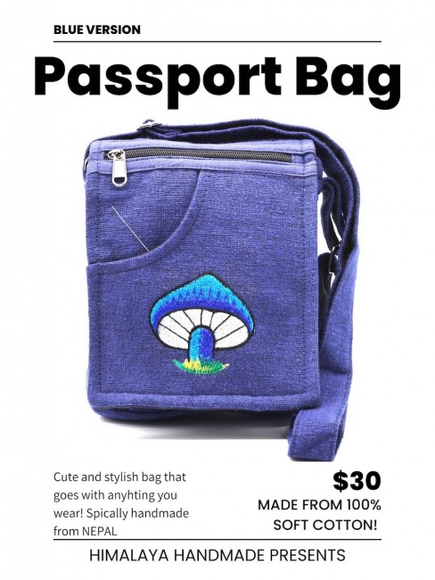 This beautiful Mushroom embroidered 100% pure cotton passport bags are handmade in Nepal. This beautiful passport bag features are it has one pocket in the front & one pocket in the back, it has two compartments, a large main compartment with zippered pocket inside and it has a long adjustable strap 11”-24” inch which you can clutch the bag across your body. This cotton passport bag is extraordinary and fashionable. This passport bag is suitable for carrying document, Mini Tablet, Mobile Phone and Purses.