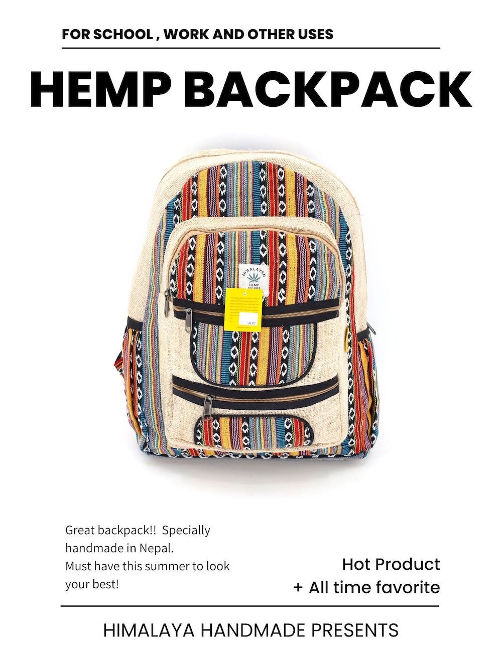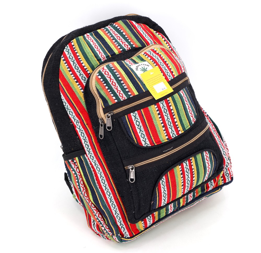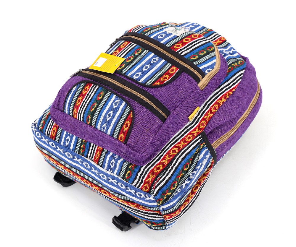 At Himalaya Handmade we are known for creating the modern hemp backpacks that are now available in profusion of design and colors. Our Mini backpack with multicolor Aztec pattern is made from eco-friendly natural hand-woven hemp and cotton fabric and it is beautifully handcrafted in Nepal, they are high quality and this backpack has everything you need. You will not find higher quality anywhere else. All of our bags are sourced from the mountainous regions of Nepal and are all 100% Handmade. This backpack features are it has a unique multi colored pocket. Handcrafted this Backpack Includes, laptop compartment – fits any type and size, 4 separate zippered compartments with 2 pockets, 2 water bottle holders, extremely strong construction, strong original two metal zippers on main compartment, soft padded straps and made from 100% Hemp, the entire bag is extremely strong but also breathable. Color of these bag will not be exact because arrangement of the pattern and these bags are handmade so in color can be slightly different. Pictures color are just example. Every bag is handmade and therefore unique.
