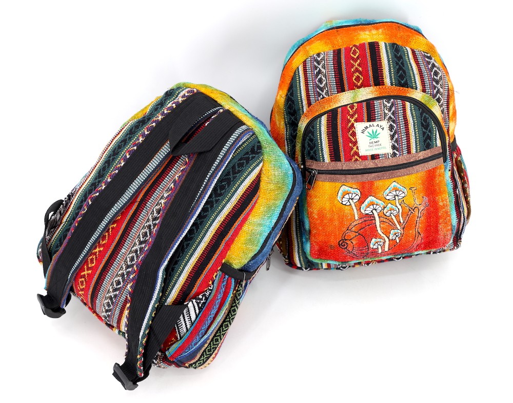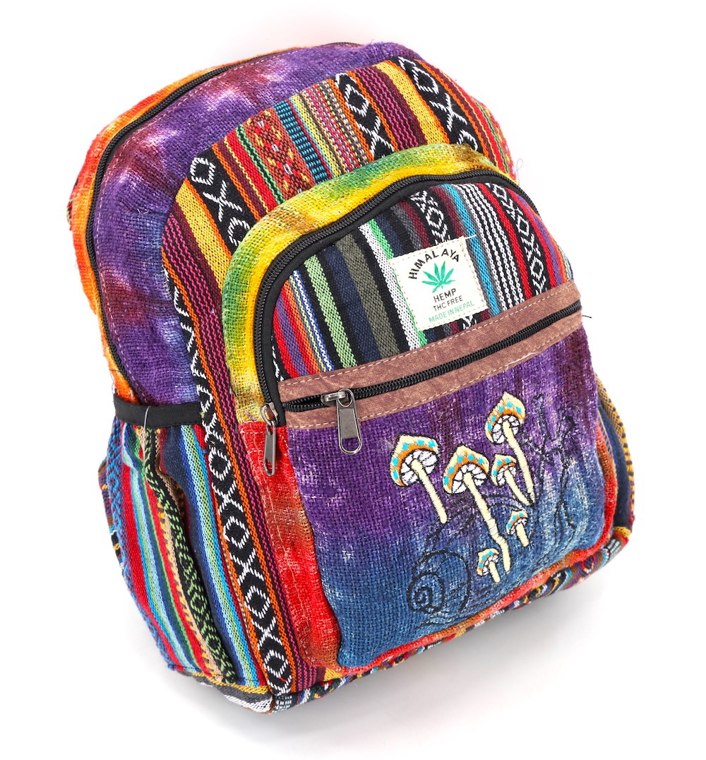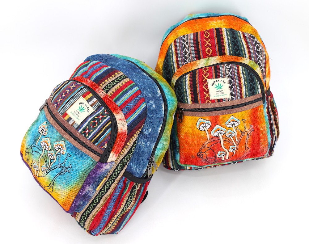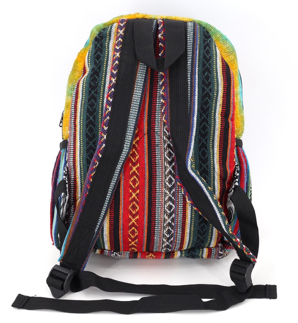 • At Himalaya Handmade we are known for creating the modern Mini hemp backpacks that are now available in a vast array of design and colors. Our Mini backpack with multicolor Aztec pattern which is made from eco-friendly natural hand-woven hemp and cotton fabric which is beautifully handcrafted in Nepal, they are of high quality and our backpacks have everything that you will need. You will not find products of higher quality anywhere else. All of our bags are sourced from the mountainous regions of Nepal and are all 100% Handmade. This backpack features are it has a unique multi colored pocket. Handcrafted this uniquely versatile Backpack comes with 2 pockets on the front both zippered and secured with a Velcro, the larger front pocket also has a zippered anti-theft pocket as well as compartment that can be used to store objects as large as 12 inches, There is also a secret back pocket which is zippered and can be used to contains various items, the bag also comes equipped with 2 water bottle holders. The bag has extremely strong construction, it has strong original two metal zippers on main compartment, soft padded straps and made from 100% Hemp, the entire bag is extremely strong but also breathable. Color of these bag will not be exact because arrangement of the pattern and the nature of these bags being handmade can cause the colors and patterns to be slightly different. Images for this bag are an overall example to what the bag looks like. Every bag is handmade and therefore unique.