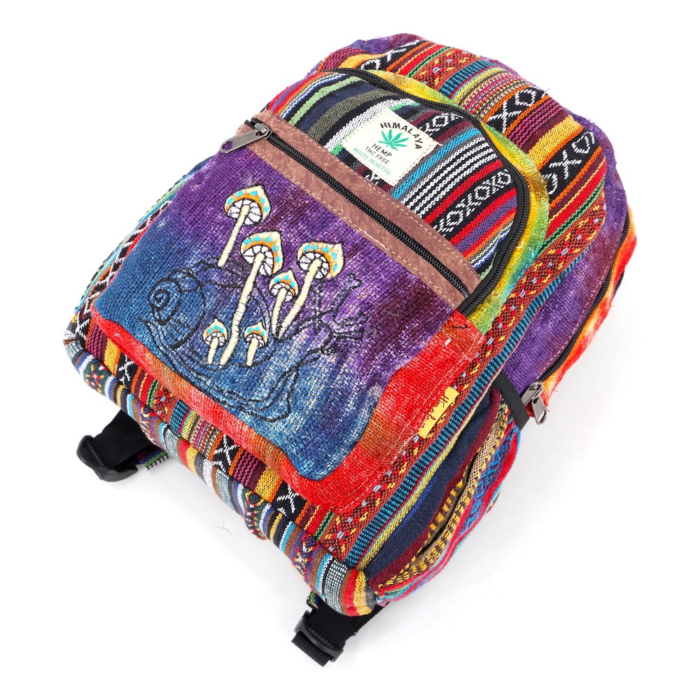 A versatile and beautiful Tie Dye Snail Mushroom Hand Embroidery Hemp Backpack made by 100% Natural THC Free Himalaya Hemp Fabric stitched by talented artisans in Himalaya Range of Nepal. Support underprivileged Nepalese communities with your purchase.