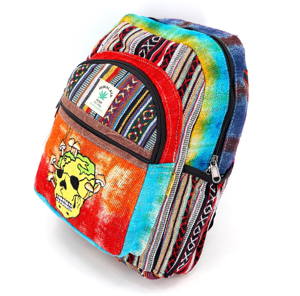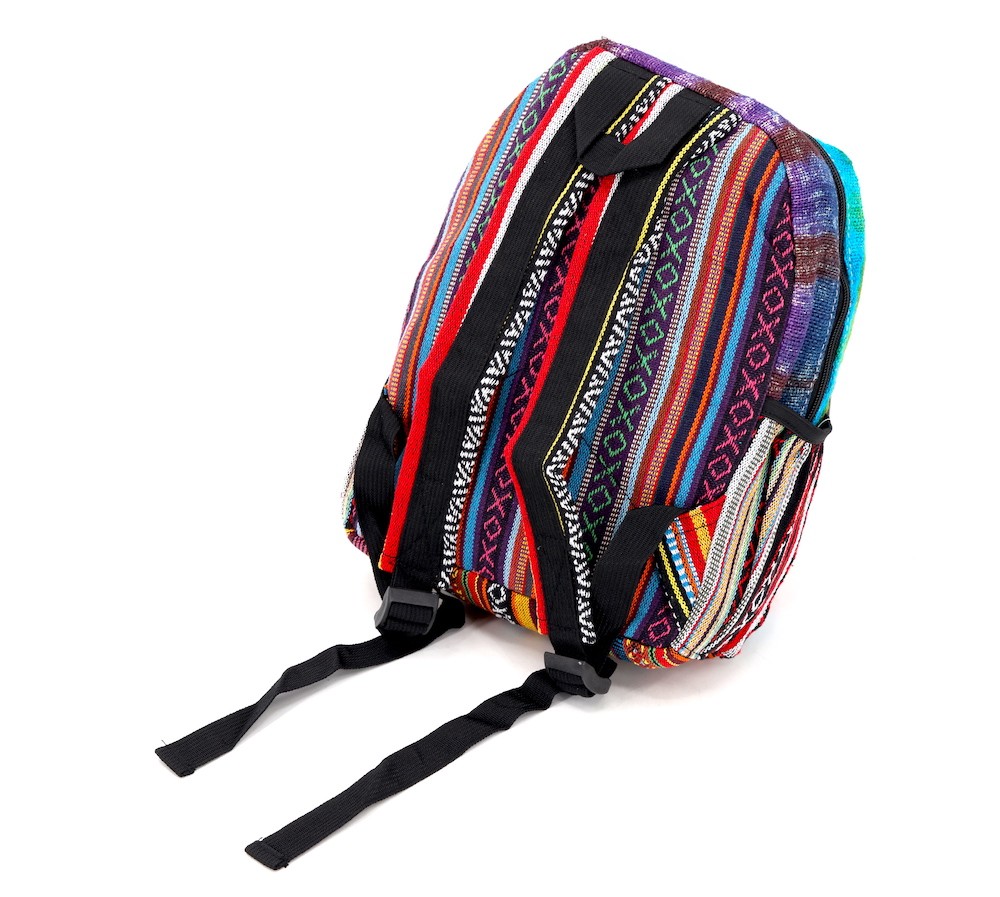 - At Himalaya Handmade we are known for creating the modern Mini hemp backpacks that are now available in a vast array of design and colors. Our Mini backpack with multicolor Aztec pattern which is made from eco-friendly natural hand-woven hemp and cotton fabric which is beautifully handcrafted in Nepal, they are of high quality and our backpacks have everything that you will need. You will not find products of higher quality anywhere else. All of our bags are sourced from the mountainous regions of Nepal and are all 100% Handmade. This backpack features are it has a unique multi colored pocket. Handcrafted this uniquely versatile Backpack comes with 2 pockets on the front both zippered and secured with a Velcro, the larger front pocket also has a zippered anti-theft pocket as well as compartment that can be used to store objects as large as 12 inches, There is also a secret back pocket which is zippered and can be used to contains various items, the bag also comes equipped with 2 water bottle holders. The bag has extremely strong construction, it has strong original two metal zippers on main compartment, soft padded straps and made from 100% Hemp, the entire bag is extremely strong but also breathable. Color of these bag will not be exact because arrangement of the pattern and the nature of these bags being handmade can cause the colors and patterns to be slightly different. Images for this bag are an overall example to what the bag looks like. Every bag is handmade and therefore unique.