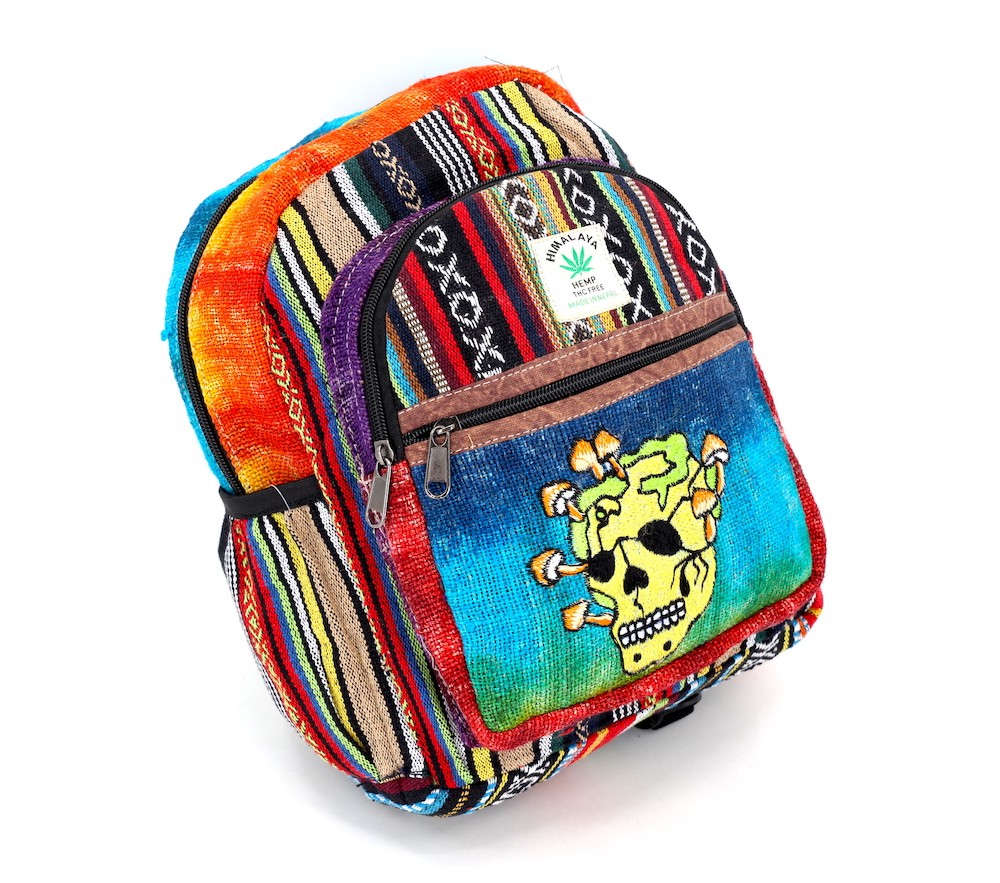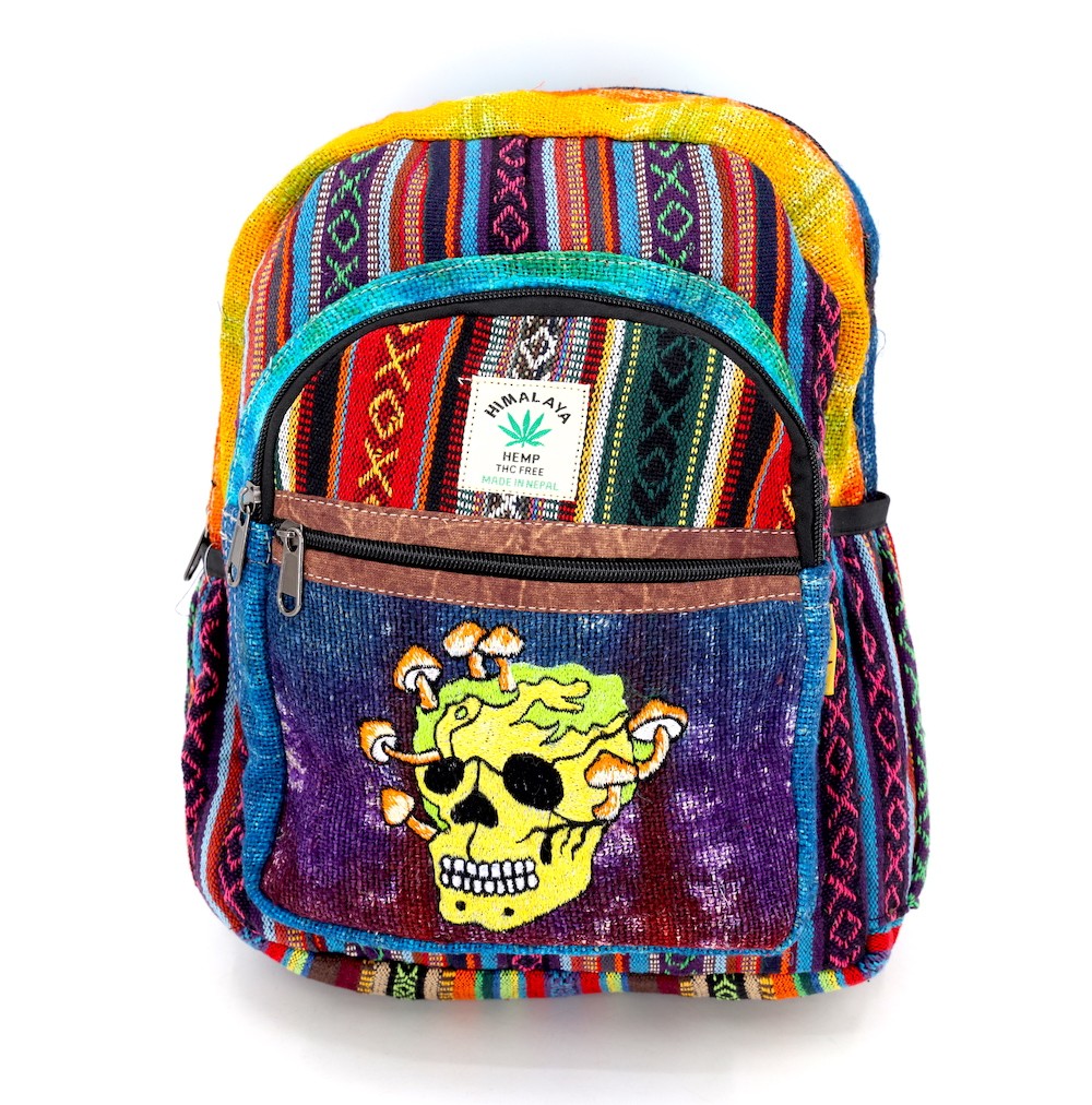 A versatile and beautiful Skull Mushroom Hand Embroidery Hemp Backpack made by 100% Natural THC Free Himalaya Hemp Fabric stitched by talented artisans in Himalaya Range of Nepal. Support underprivileged Nepalese communities with your purchase.