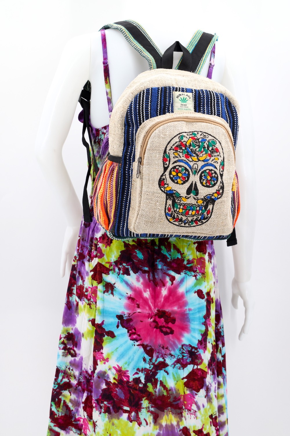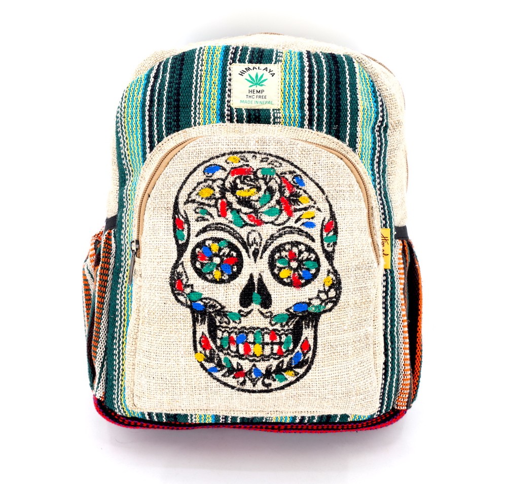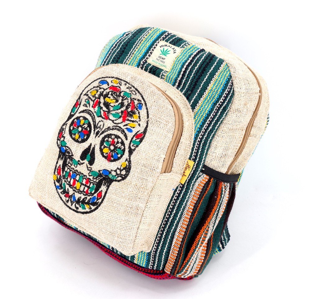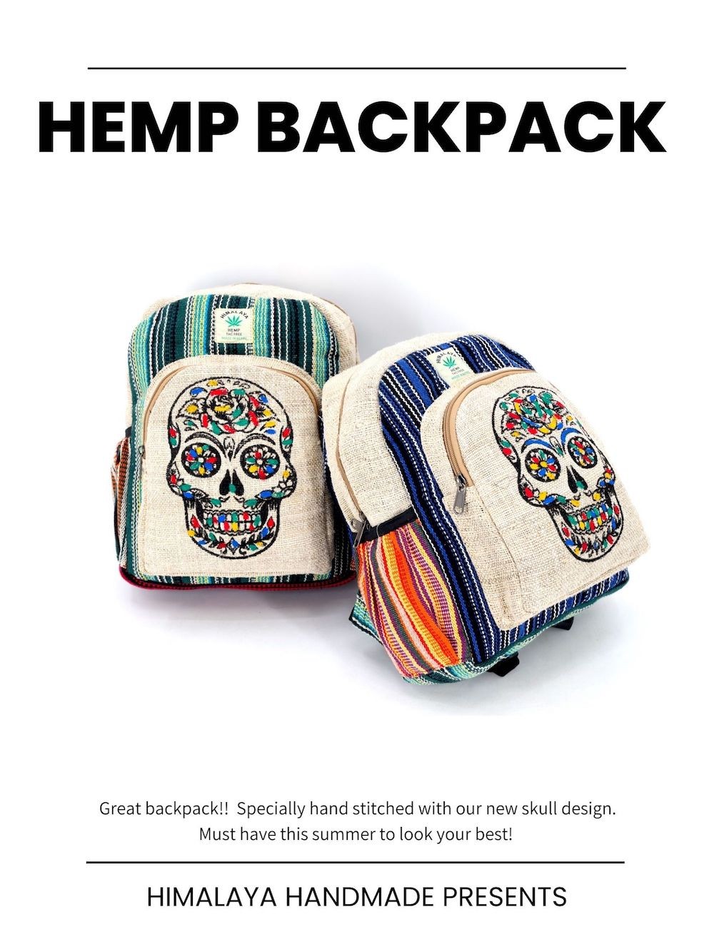 A versatile and beautiful Skull Hand Embroidered Hemp Backpack made by 100% Natural THC Free Himalaya Hemp Fabric stitched by talented artisans in Himalaya Range of Nepal. Support underprivileged Nepalese communities with your purchase.