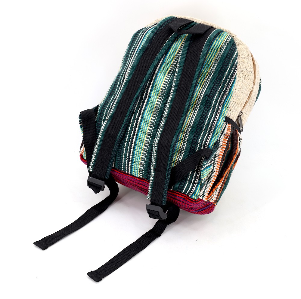 - At Himalaya Handmade we are known for creating the modern hemp backpacks that are now available in a vast array of design and colors. Our backpacks come in multicolor Aztec patterns which is made from eco-friendly natural hand-woven hemp and cotton fabric which is beautifully handcrafted in Nepal, they are of high quality and our backpacks have everything that you will need. You will not find products of higher quality anywhere else. All of our bags are sourced from the mountainous regions of Nepal and are all 100% Handmade. This backpack features are that it has a unique multi colored pocket. Handcrafted this uniquely versatile Backpack comes with 2 pockets on the front both of which are zippered, the larger front pocket also has a zippered anti-theft pocket as well as compartment that can be used to store objects as large as 12 inches, there is also a secret back pocket which is zippered and can be used to contains various items, the bag also comes equipped with 2 water bottle holders. This bag is an extremely strong backpack, it has strong original two metal zippers on the main compartment, it has soft padded straps and it is made from 100% Hemp, the entire bag is extremely strong but also breathable. Colors of these bag will not be exact because arrangement of the pattern and the nature of these bags being handmade can cause the colors and patterns to be slightly different than each other. Images for this bag are an overall example to what the bag looks like. Every bag is handmade and therefore unique.