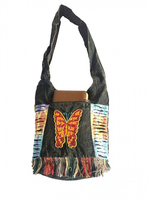 Pure 100% stone Wash cotton Butterfly hand Embroidery Yoga bag is handmade in Nepal. This Yoga bag has 3 compartments with zippers, in the main compartment it has secret pocket at 8"-7" inches also has pocket with flap cover and with velcor clouser. It is supremely versatile and fashionable. This bag is suitable for carrying passport, mobile phone and mini iPad and other nesecities. It is fair trade product. Could be hand washed or machine washed in cold water.