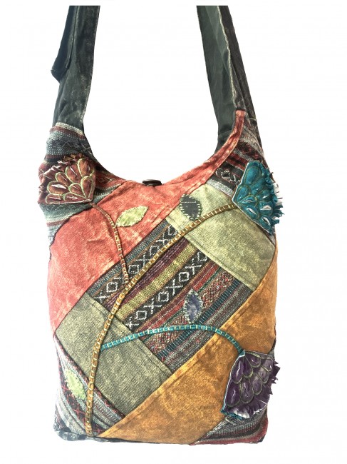 Pure 100% cotton Stonewashed Patch floweral Yoga bag is handmade in Nepal. This Yoga bag has hidden pocket with zipper closuer inside the main compartment and the dimention of teh hidden pocket 7'' X 6'', The main compartment with zipper closuer also it has string with key ring on it which gives extra looks and also it has pocket on teh strap with flap cover and with velcor clouser where you can keep accessories. It is supremely versatile and fashionable. This bag is suitable for carrying passport, mobile phone and mini iPad and other nesecities. It is fair trade product. Could be hand washed or machine washed in cold water.