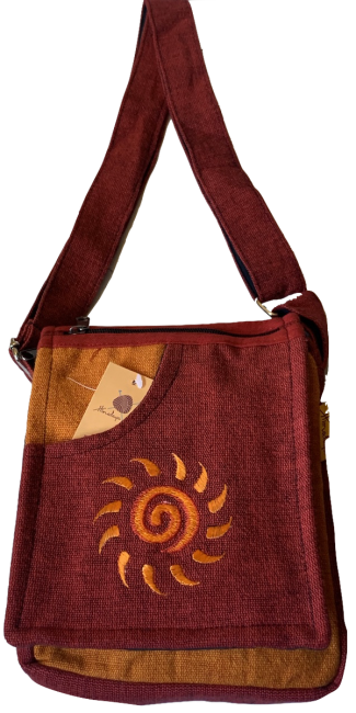 This beautiful Sun embroidered 100% pure cotton passport bags are handmade in Nepal. This beautiful passport bag features are it has one pocket in the front & one pocket in the back, it has two compartment, a large main compartment with zippered pocket inside and it has a long adjustable strap which you can clutch the bag across your body. This cotton passport bag is extraordinary and fashionable. This passport bag is suitable for carrying document and Ipad.