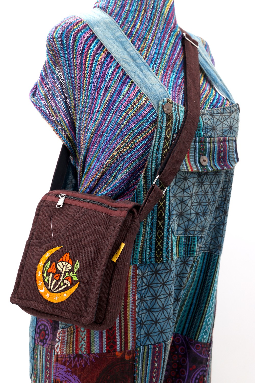 The beautiful Hand-Woven Cotton Travel bag is hand made in Nepal with pure 100% organic Himalaya Cotton. This modern Mushroom Embroidery Cotton passport bag is supremely versatile and fashionable. This bag features are it has two compartments with zippers and it has adjustable strap with outside two pockets in the front and in the main pocket above with a zipper. It is a fair trade made product.