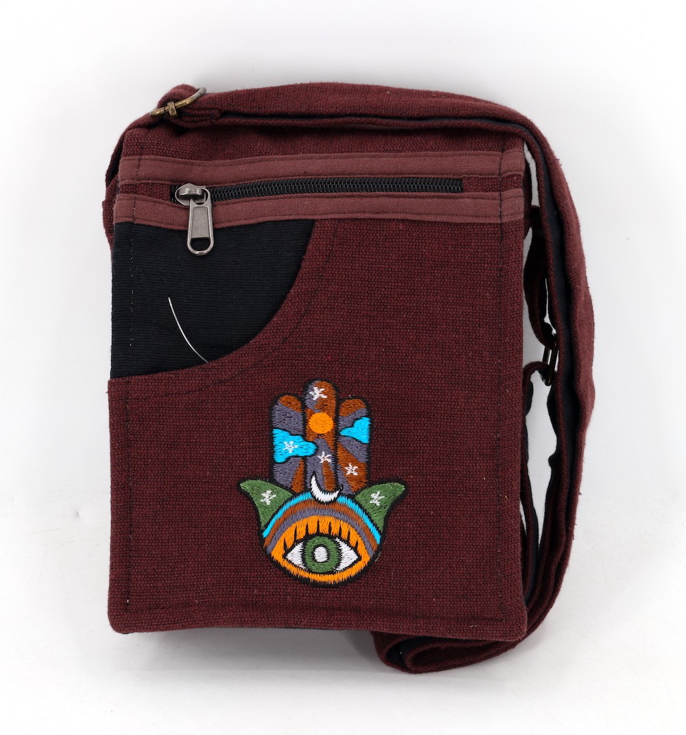 The beautiful Hand-Woven Cotton Travel bag is hand made in Nepal with pure 100% organic Himalaya Cotton. This modern Mushroom Embroidery Cotton passport bag is supremely versatile and fashionable. This bag features are it has two compartments with zippers and it has adjustable strap with outside two pockets in the front and in the main pocket above with a zipper. It is a fair trade made product.
