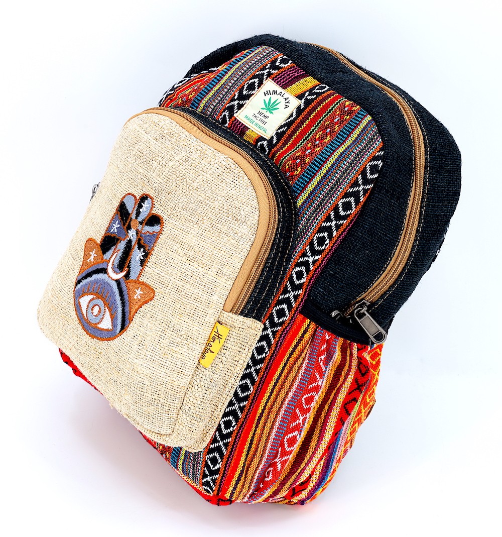 A versatile and beautiful Hamsa Hand, Hand Embroidered Hemp Backpack made with 100 percent natural THC-free Himalaya hemp. Stitched and assembled by the most talented artisans in Nepal.