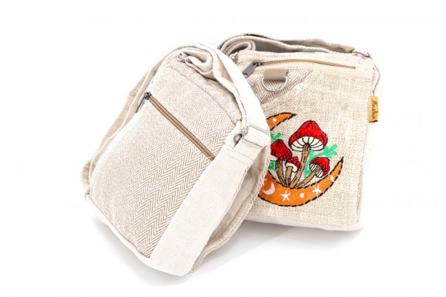 A versatile and beautiful Moon Mushroom hand embroidery 100% Natural THC Free Himalaya Hemp Fabric stitched by talented artisans in Himalaya Range of Nepal. Support underprivileged Nepalese communities with your purchase. Hand wash or Machine wash separately in cold water.