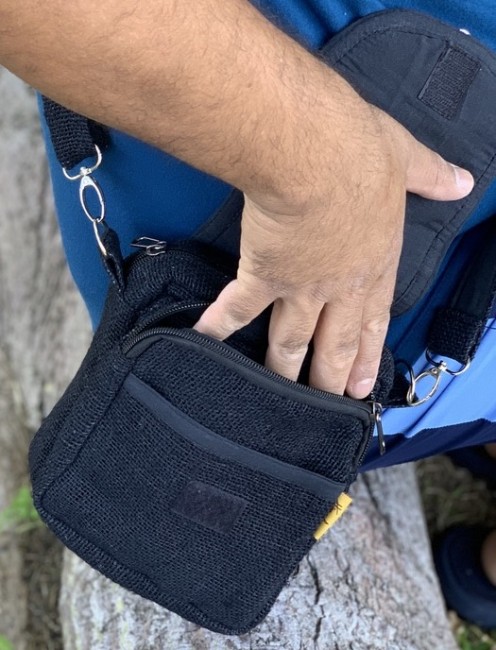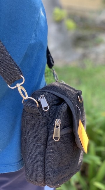 The beautiful hemp Travel bag is hand made in Nepal with pure 100% organic core hemp. This modern hemp passport bag is supremely versatile and fashionable. This bag features are it has two compartments with zippers and it has adjustable strap with outside two pockets in the front and in the main pocket above with a zipper. It is fair trade product.