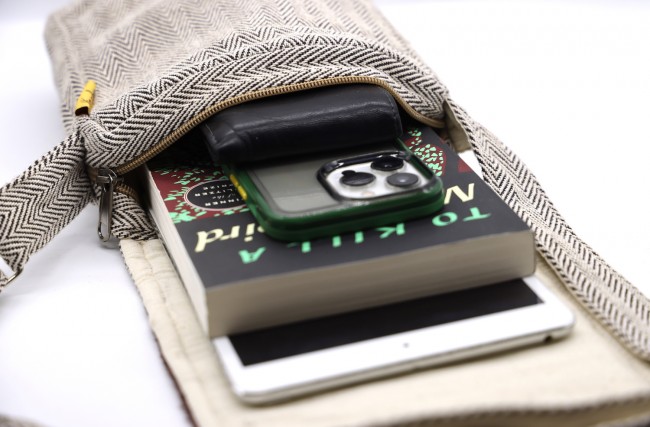 The beautiful hemp Travel bag is hand made in Nepal with pure 100% organic Himalaya hemp. This modern hemp passport bag is supremely versatile and fashionable. This bag features are it has two compartments with zippers and it has adjustable strap with outside two pockets in the front and in the main pocket above with a zipper. It is a fair trade made product.