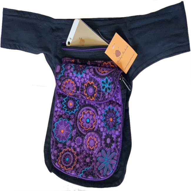 100% pure cotton colorful money belt handmade in Nepal. This product can be use by both man and women. This bag has charming features, it has beautiful print and flower embroideries,it is practical and versatile because it can be belt bag/fanny pack /shoulder bag, it has 3 pocket with zippers, main pocket has magnetic button, 1 pocket is hidden on the back side, small pocket on the outside also has magnetic button, the belt is adjustable which can make shorter and longer as well. It is fair trade product.