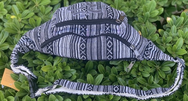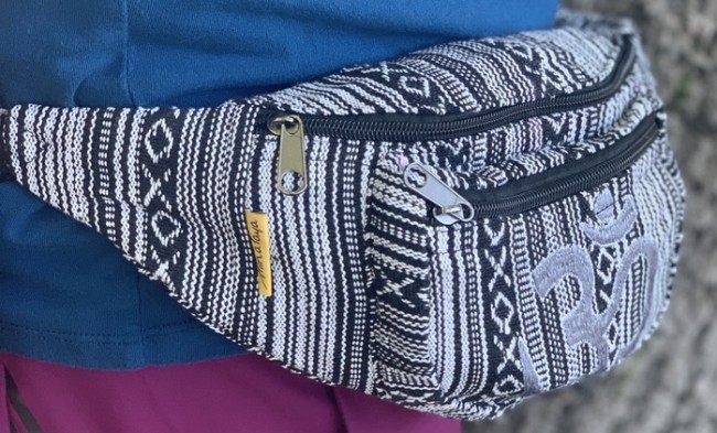 100% pure Hand woven Gheri Cotton Multi Black Color Om Hand Embroidary money belt (Fanny Pack) handmade in Nepal. This product can be use by both men and women west or can be worn lower on the hips. This bag has charming features, it is practical and versatile because it can be belt bag/fanny pack /shoulder bag, it has 3 pockets with zippers, the belt is adjustable 32 - 45 inch which can make shorter and longer as well. It is fair trade product. Size: 29 x14x10 cm (12.5x5.5x4 inches)