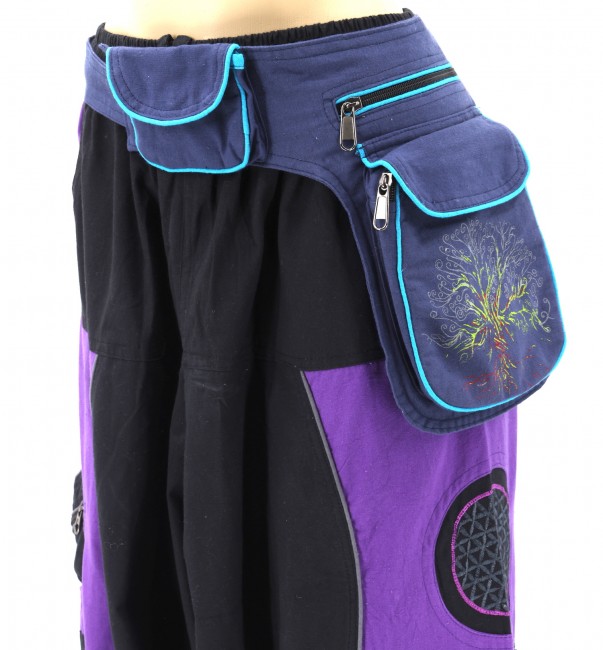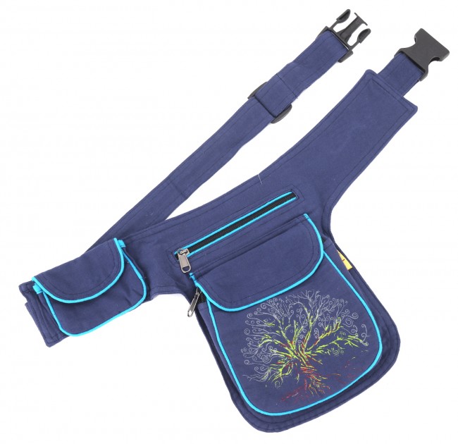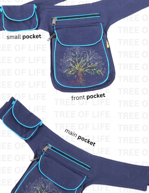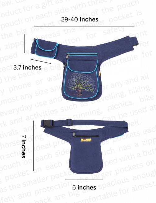 100% pure cotton Tree of Life designed Fanny Pack is handmade in Nepal. This product can be used by women or men and is usually worn lower on the hips. This bag has charming features, it has a beautiful print of the Tree of life, it is practical and versatile because it can be used as a belt bag, fanny pack as well as a shoulder bag, it has 3 pockets in the front with zippers and additionally all three pockets come equipped with a zipper, A pocket is hidden on the back side, the belt is adjustable from 29 - 40 inches which can be made shorter and longer to tend to your needs, and the belt also includes a small compartment which is big enough to fit coins and money. This is a Fair-Trade product.