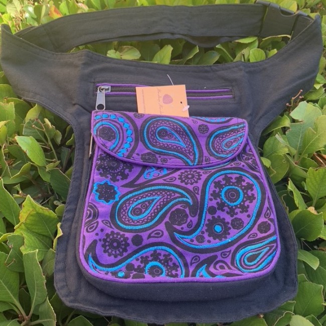 100% pure cotton colorful money belt handmade in Nepal. This product can be use by both man and women. This bag has charming features, it has beautiful print and flower embroideries,it is practical and versatile because it can be belt bag/fanny pack /shoulder bag, it has 3 pocket with zippers, main pocket has magnetic button, 1 pocket is hidden on the back side, small pocket on the outside also has magnetic button, the belt is adjustable which can make shorter and longer as well. It is fair trade product.