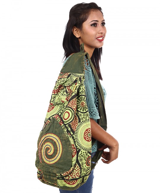 This beautiful Mandala printed with spiral embroidered 100% pure cotton back pack are handmade in Nepal. This beautiful back pack features are it has two compartment with zippers, it has secrete pocket with zipper in side the main compartment, two pocket on the side, the main compartment has cover and it has a long adjustable soft strap and this back pack pack is unique, extraordinary,versatile and fashionable. It can be folded in heart shape as well. This cotton back pack is fair trade product.