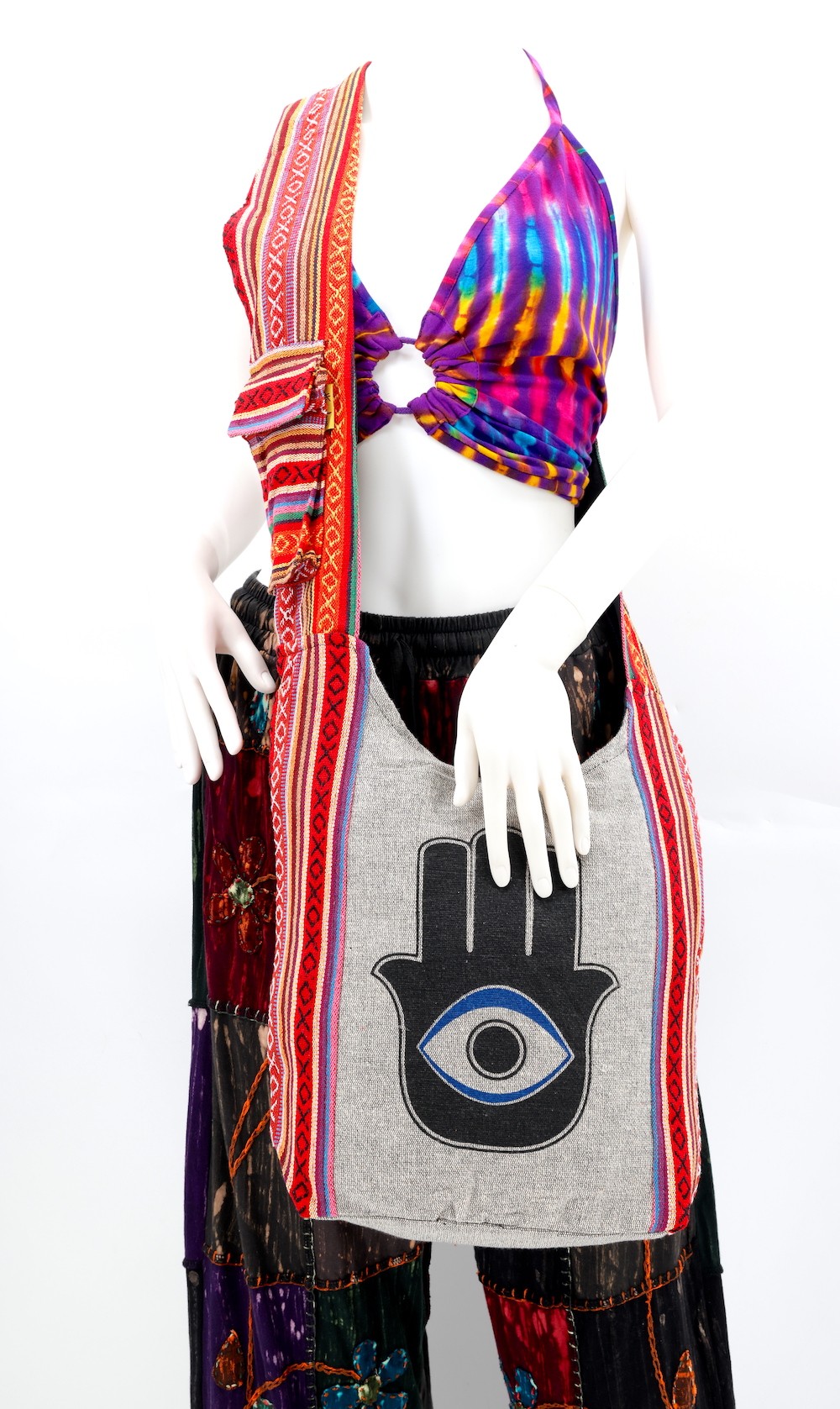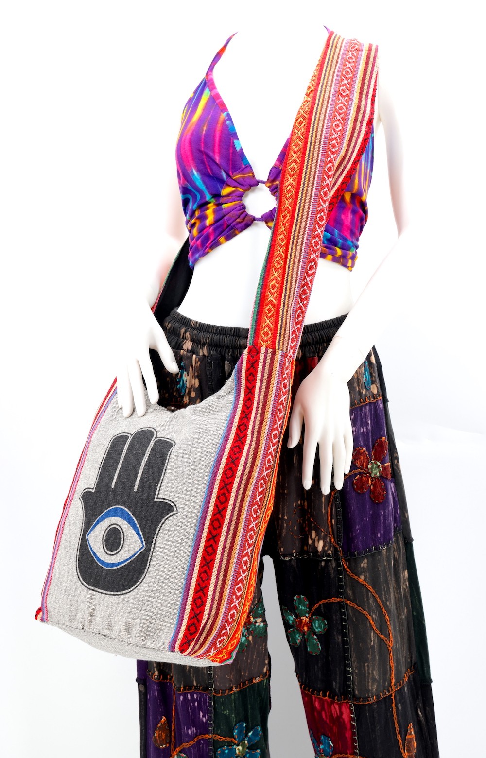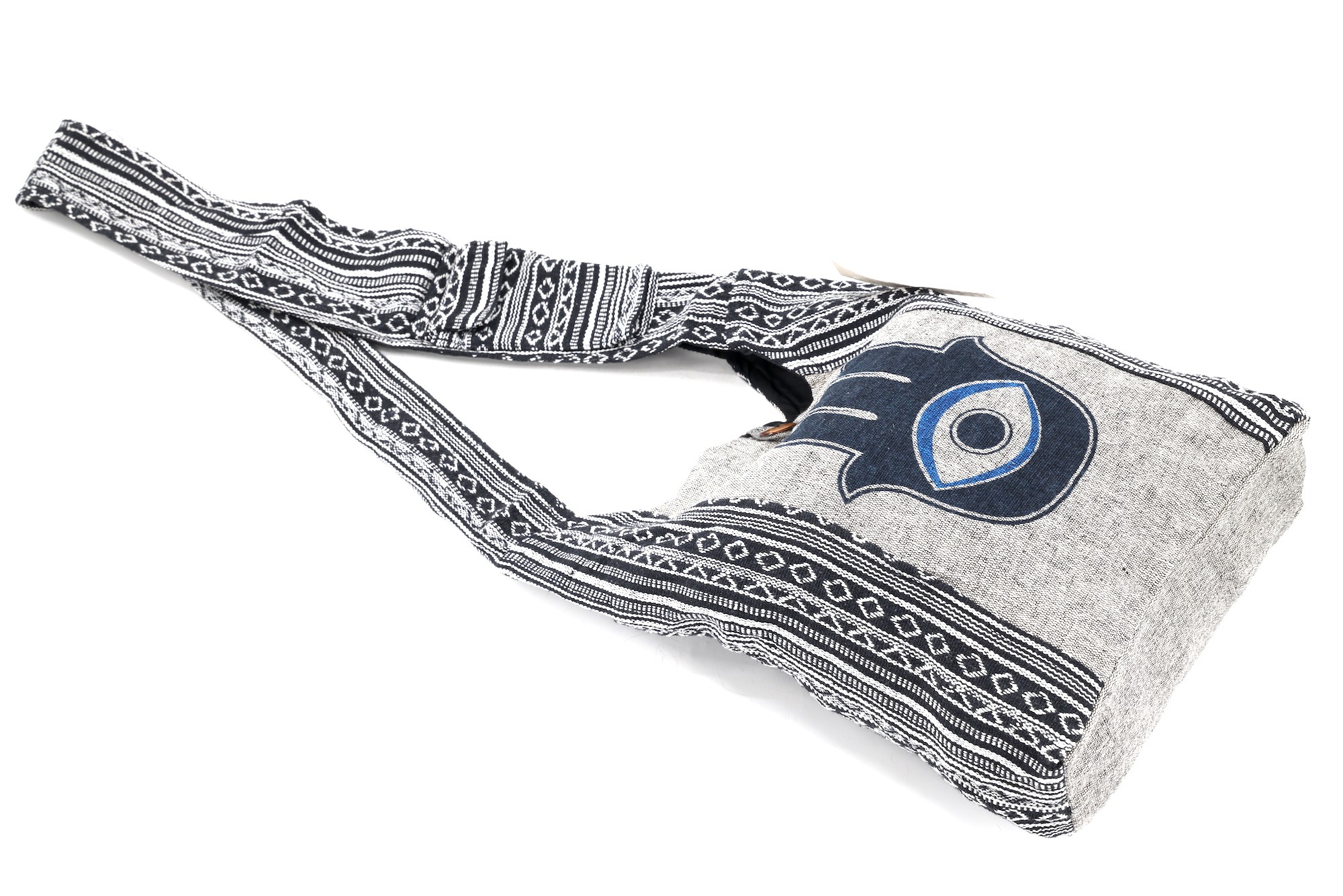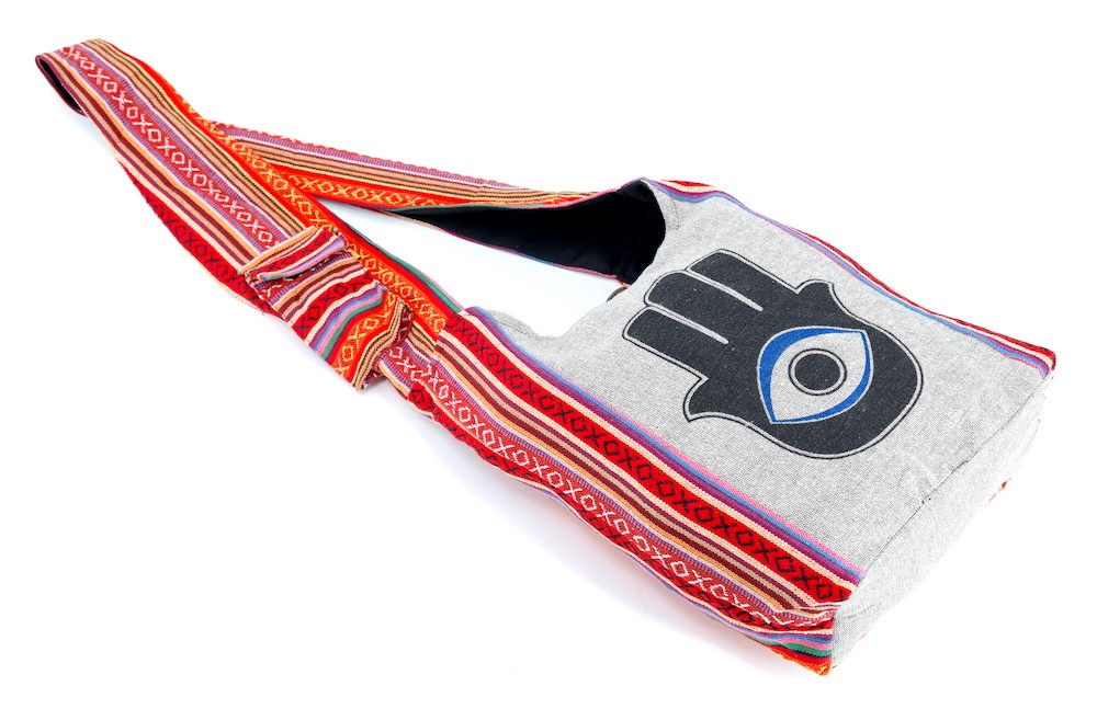 A versatile and beautiful Hamsa Evil Eye Print Handmade Cotton Crossbody Bag made with 100 percent natural handwoven cotton. Stitched and assembled by the most talented artisans in Nepal.