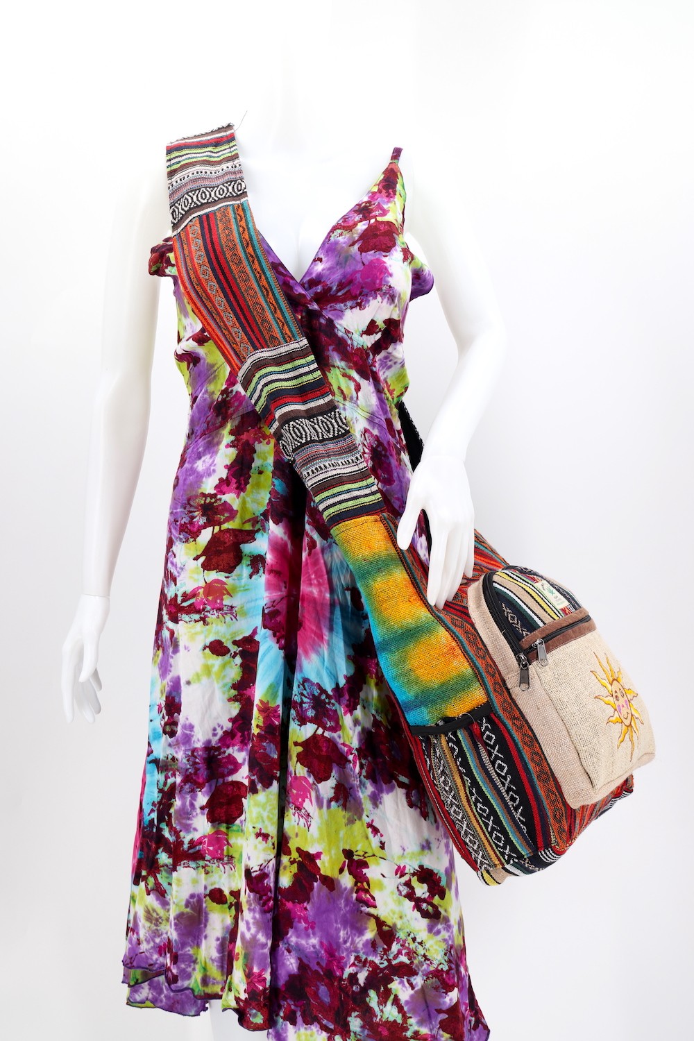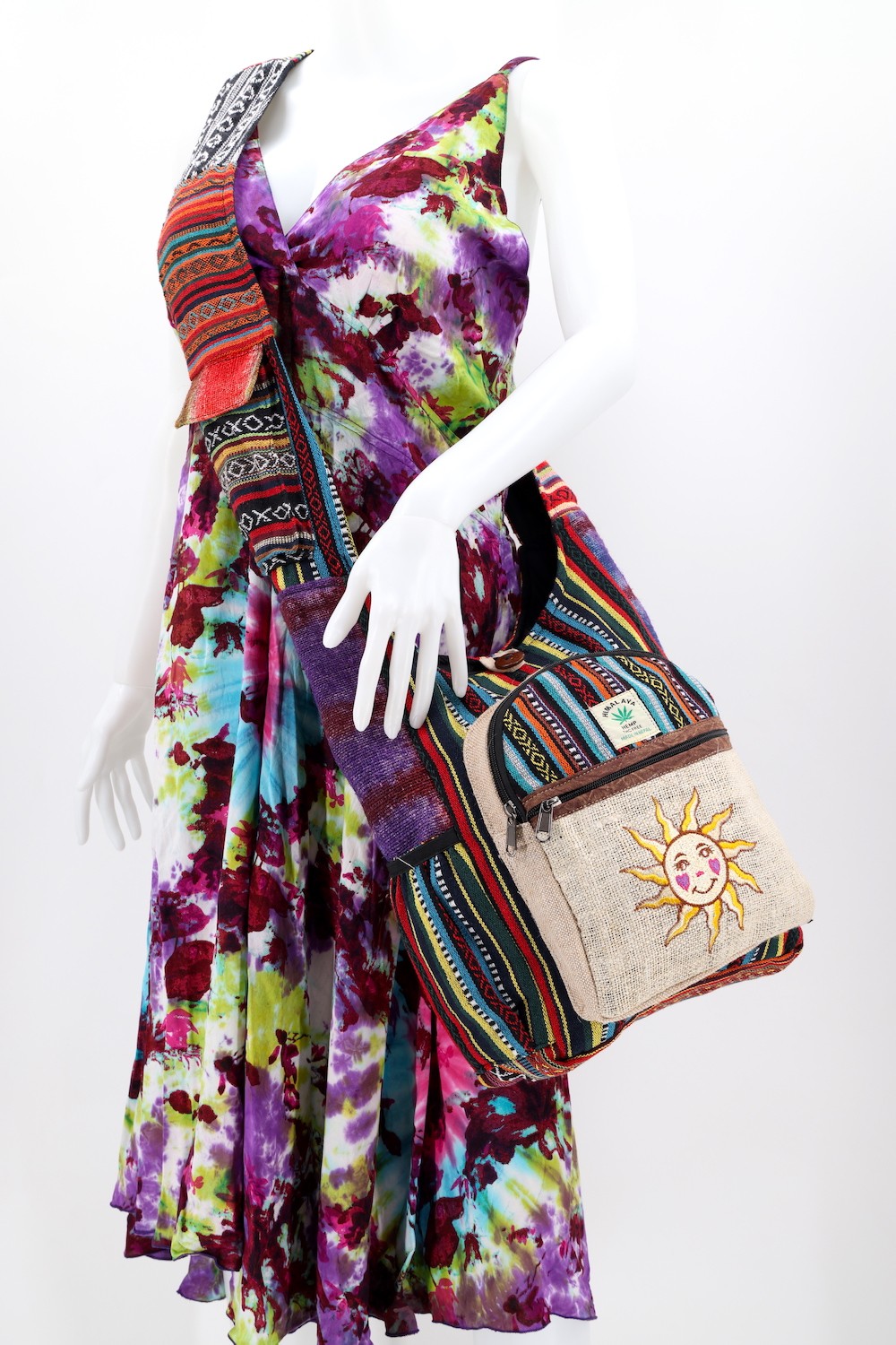 A versatile and beautiful sun embroidery colorful 100% Natural Handwoven Hemp stitched by talented artisans in Himalaya range of Nepal. Purchasing means supporting underprivileged Nepalese communities who help make these bags.