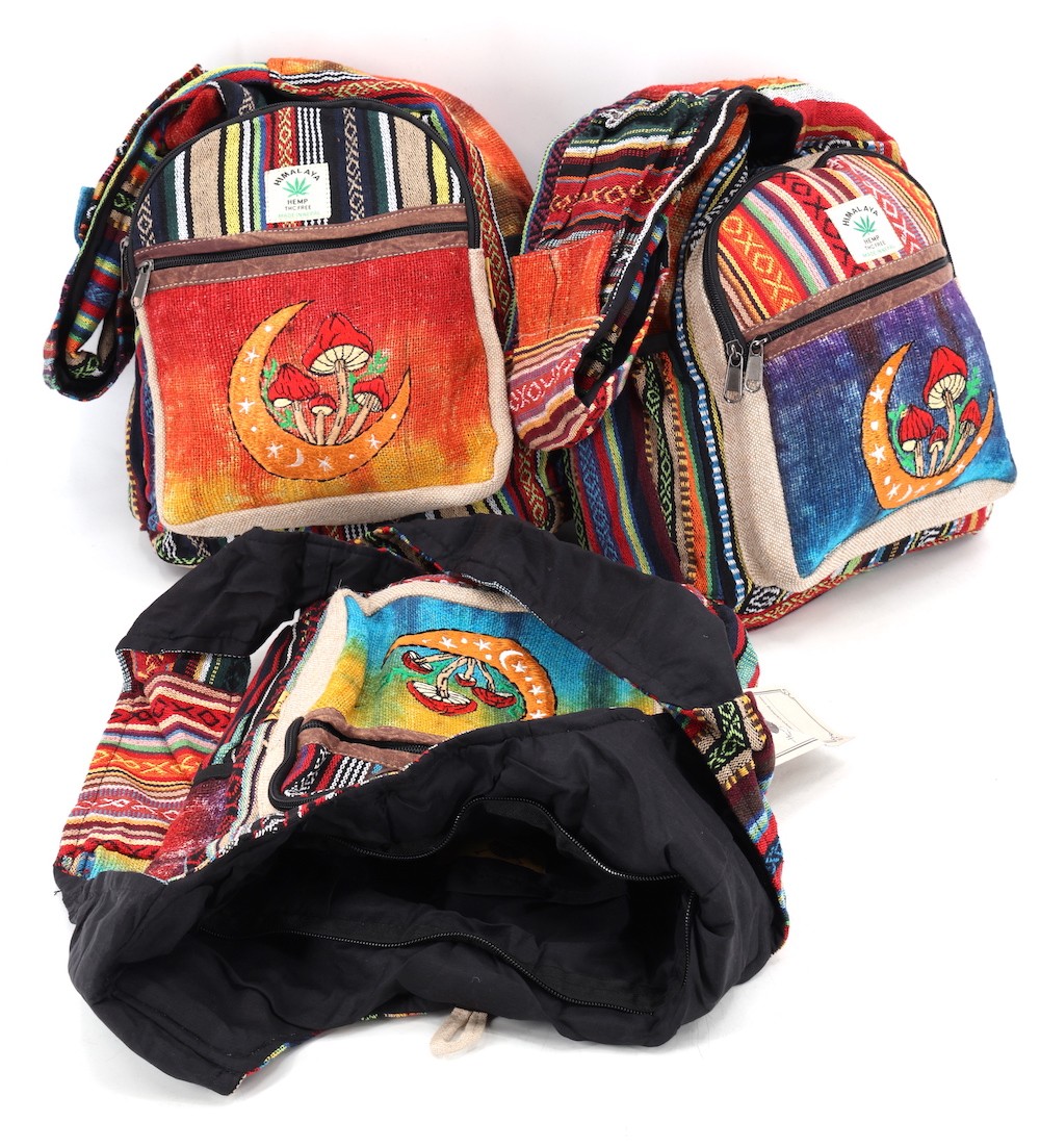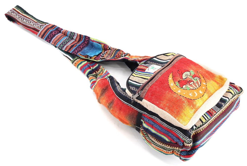 A versatile and beautiful Moon Mushroom embroidery colorful 100% Natural Handwoven Hemp Crossbody Bag stitched by talented artisans in Himalaya range of Nepal. Purchasing means supporting underprivileged Nepalese communities who help make these bags.