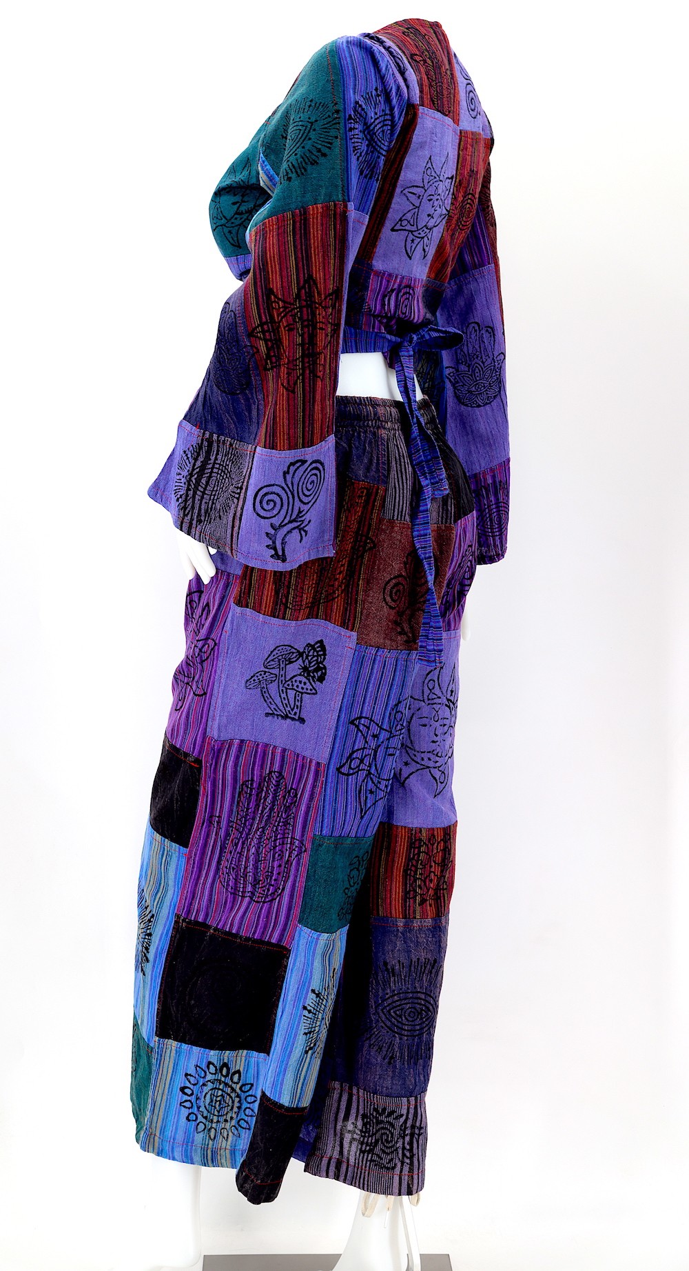 Every clothing item is meticulously handmade, reflecting the care and consideration put into their creation, resulting in unmatched quality. Because our products are handmade, the patchwork colors and patterns on each pair of trousers and tops may vary, making each one unique. The provided image serves as a general representation of the product's appearance.