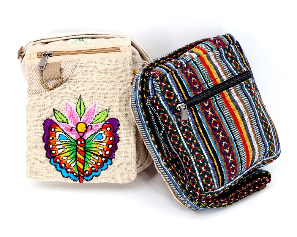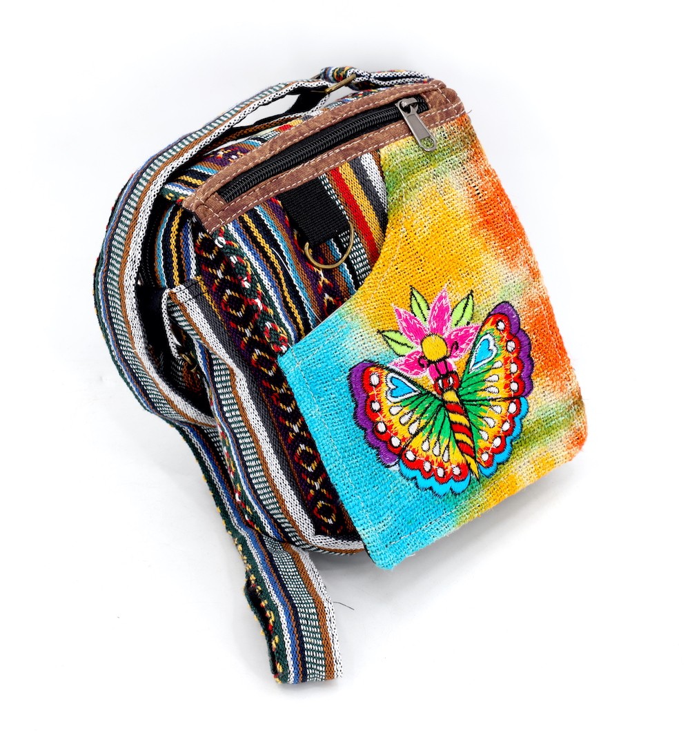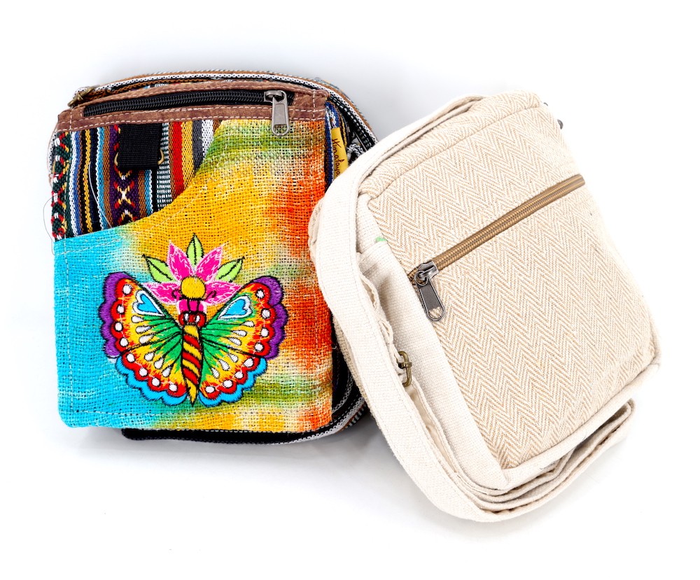 The beautiful hemp Travel bag is hand made in Nepal with pure 100% organic Himalaya hemp. This modern hemp passport bag is supremely versatile and fashionable. This bag features are it has two compartments with zippers and it has adjustable strap with outside two pockets in the front and in the main pocket above with a zipper. It is a fair trade made product.