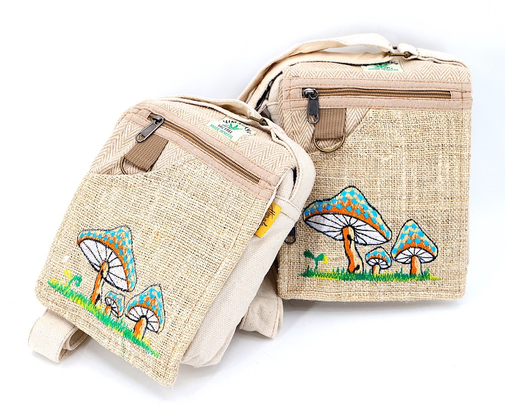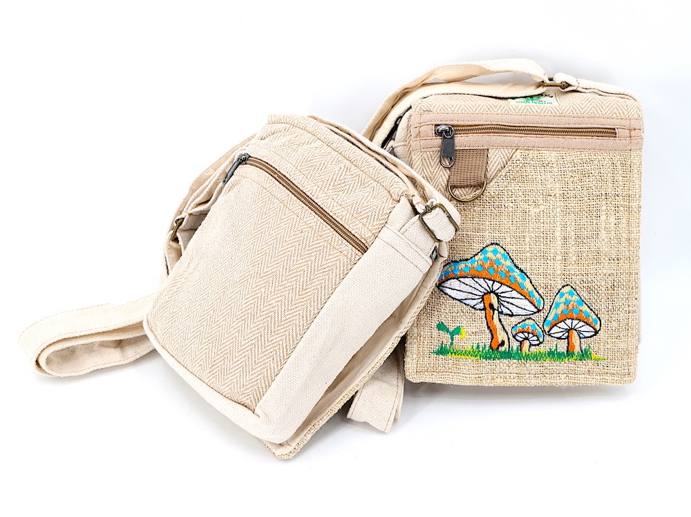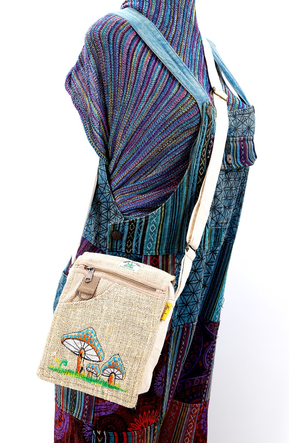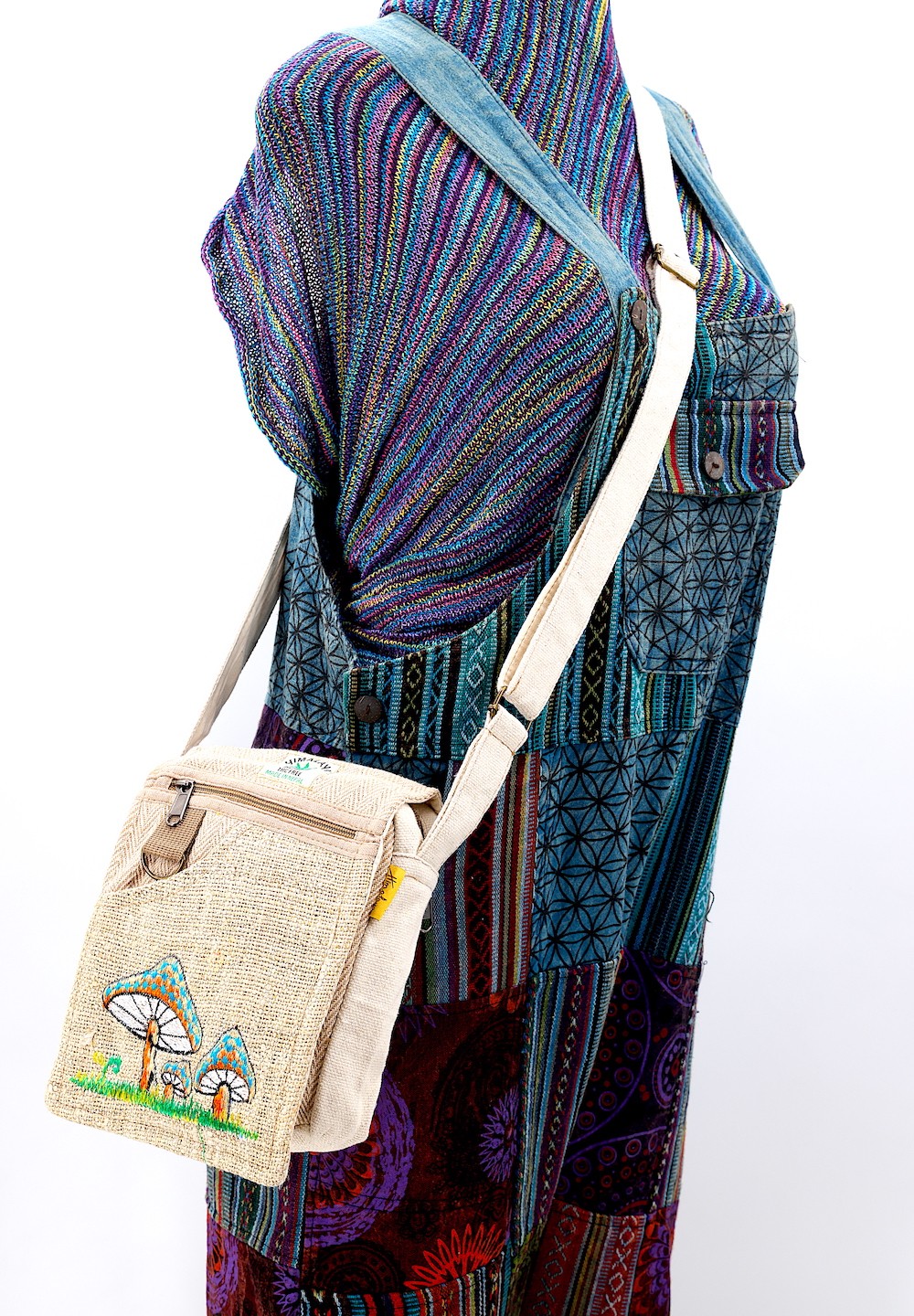 A versatile and beautiful Mushroom Hand Embroidered Hemp Passport Crossbody Bag made with 100 percent natural THC-free Himalaya hemp. Stitched and assembled by the most talented artisans in Nepal.