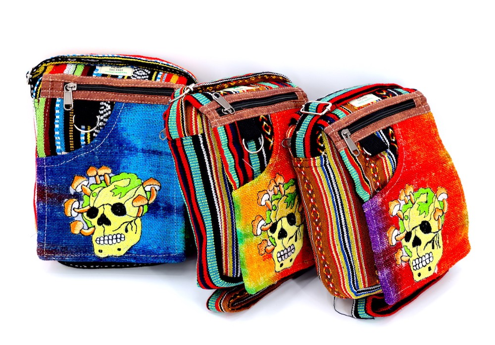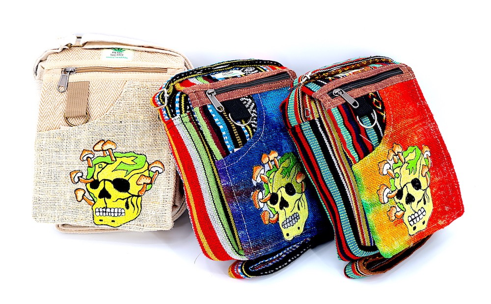 A versatile and beautiful Skull Mushroom Hand Embroidered Hemp Passport Crossbody Bag made with 100 percent natural THC-free Himalaya hemp. Stitched and assembled by the most talented artisans in Nepal.