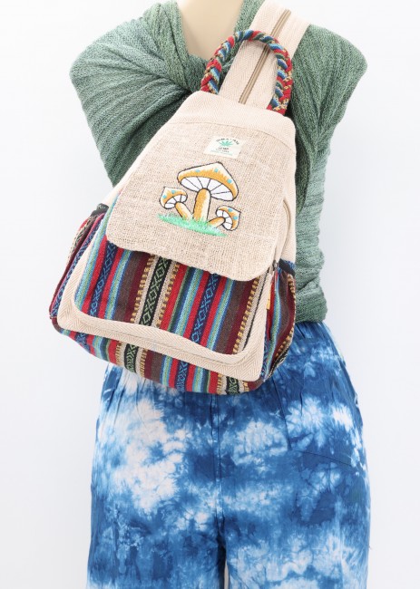 - At Himalaya Handmade we are known for creating the modern Mini hemp backpacks that are now available in a vast array of design and colors. Our Mini backpack with multicolor Aztec pattern which is made from eco-friendly natural hand-woven hemp and cotton fabric which is beautifully handcrafted in Nepal, they are of high quality and our backpacks have everything that you will need. You will not find products of higher quality anywhere else. All of our bags are sourced from the mountainous regions of Nepal and are all 100% Handmade. This backpack features are it has a unique multi colored pocket. Handcrafted this uniquely versatile Backpack comes with 2 pockets on the front both zippered and secured with a Velcro, the larger front pocket also has a zippered anti-theft pocket as well as compartment that can be used to store objects as large as 12 inches, There is also a secret back pocket which is zippered and can be used to contains various items, the bag also comes equipped with 2 water bottle holders. The bag has extremely strong construction, it has strong original two metal zippers on main compartment, soft padded straps and made from 100% Hemp, the entire bag is extremely strong but also breathable. Color of these bag will not be exact because arrangement of the pattern and the nature of these bags being handmade can cause the colors and patterns to be slightly different. Images for this bag are an overall example to what the bag looks like. Every bag is handmade and therefore unique
