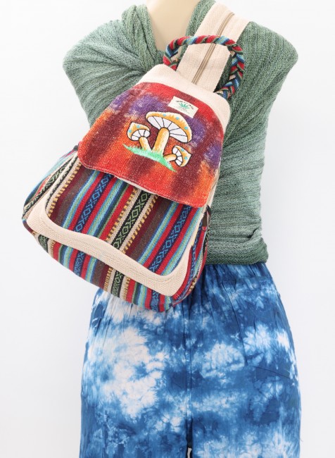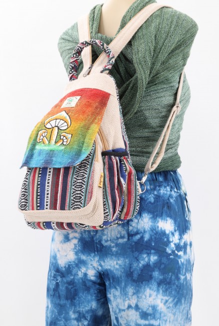 • At Himalaya Handmade we are known for creating the modern Mini hemp backpacks that are now available in a vast array of design and colors. Our Mini backpack with multicolor Aztec pattern which is made from eco-friendly natural hand-woven hemp and cotton fabric which is beautifully handcrafted in Nepal, they are of high quality and our backpacks have everything that you will need. You will not find products of higher quality anywhere else. All of our bags are sourced from the mountainous regions of Nepal and are all 100% Handmade. This backpack features are it has a unique multi colored pocket. Handcrafted this uniquely versatile Backpack comes with 2 pockets on the front both zippered and secured with a Velcro, the larger front pocket also has a zippered anti-theft pocket as well as compartment that can be used to store objects as large as 12 inches, There is also a secret back pocket which is zippered and can be used to contains various items, the bag also comes equipped with 2 water bottle holders. The bag has extremely strong construction, it has strong original two metal zippers on main compartment, soft padded straps and made from 100% Hemp, the entire bag is extremely strong but also breathable. Color of these bag will not be exact because arrangement of the pattern and the nature of these bags being handmade can cause the colors and patterns to be slightly different. Images for this bag are an overall example to what the bag looks like. Every bag is handmade and therefore unique.