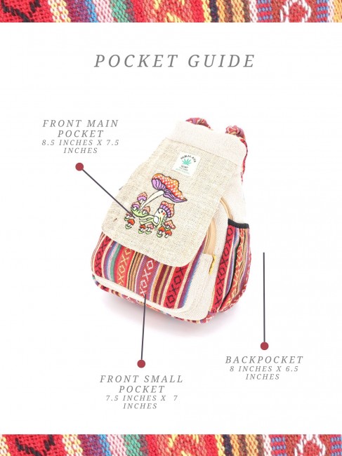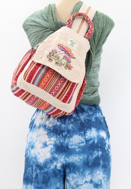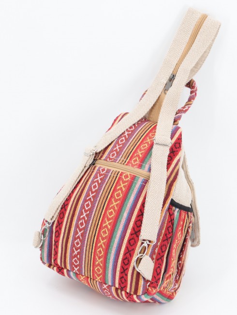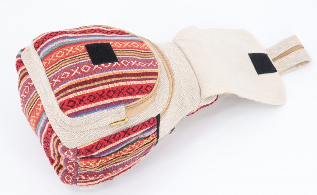 - At Himalaya Handmade we are known for creating the modern Mini hemp backpacks that are now available in a vast array of design and colors. Our Mini backpack with multicolor Aztec pattern which is made from eco-friendly natural hand-woven hemp and cotton fabric which is beautifully handcrafted in Nepal, they are of high quality and our backpacks have everything that you will need. You will not find products of higher quality anywhere else. All of our bags are sourced from the mountainous regions of Nepal and are all 100% Handmade. This backpack features are it has a unique multi colored pocket. Handcrafted this uniquely versatile Backpack comes with 2 pockets on the front both zippered and secured with a Velcro, the larger front pocket also has a zippered anti-theft pocket as well as compartment that can be used to store objects as large as 12 inches, There is also a secret back pocket which is zippered and can be used to contains various items, the bag also comes equipped with 2 water bottle holders. The bag has extremely strong construction, it has strong original two metal zippers on main compartment, soft padded straps and made from 100% Hemp, the entire bag is extremely strong but also breathable. Color of these bag will not be exact because arrangement of the pattern and the nature of these bags being handmade can cause the colors and patterns to be slightly different. Images for this bag are an overall example to what the bag looks like. Every bag is handmade and therefore unique.