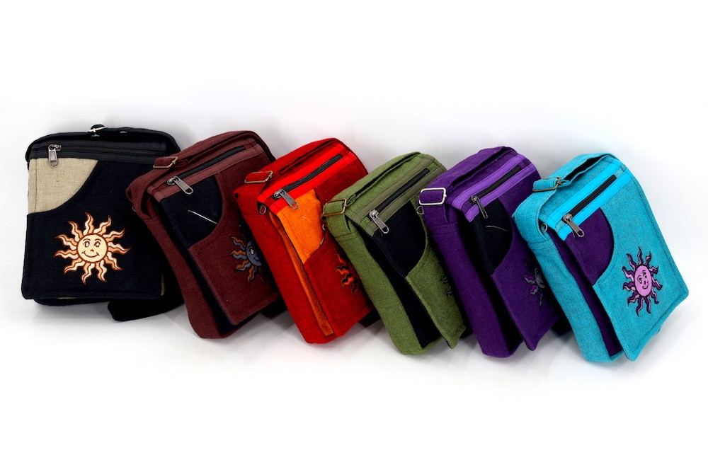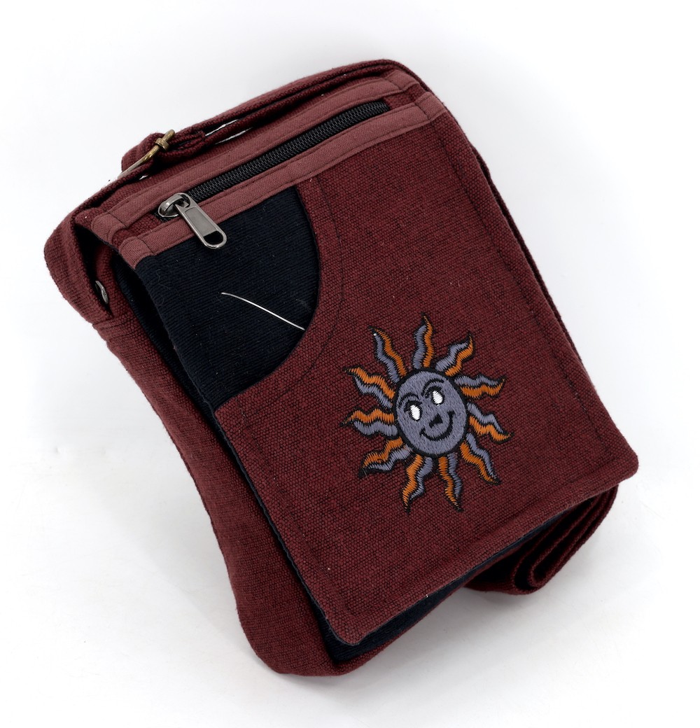 The beautiful Hand-Woven Cotton Travel bag is hand made in Nepal with pure 100% organic Himalaya Cotton. This modern Mushroom Embroidery Cotton passport bag is supremely versatile and fashionable. This bag features are it has two compartments with zippers and it has adjustable strap with outside two pockets in the front and in the main pocket above with a zipper. It is a fair trade made product.