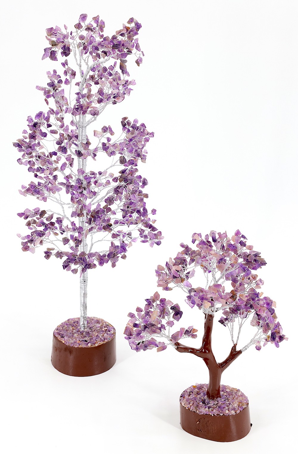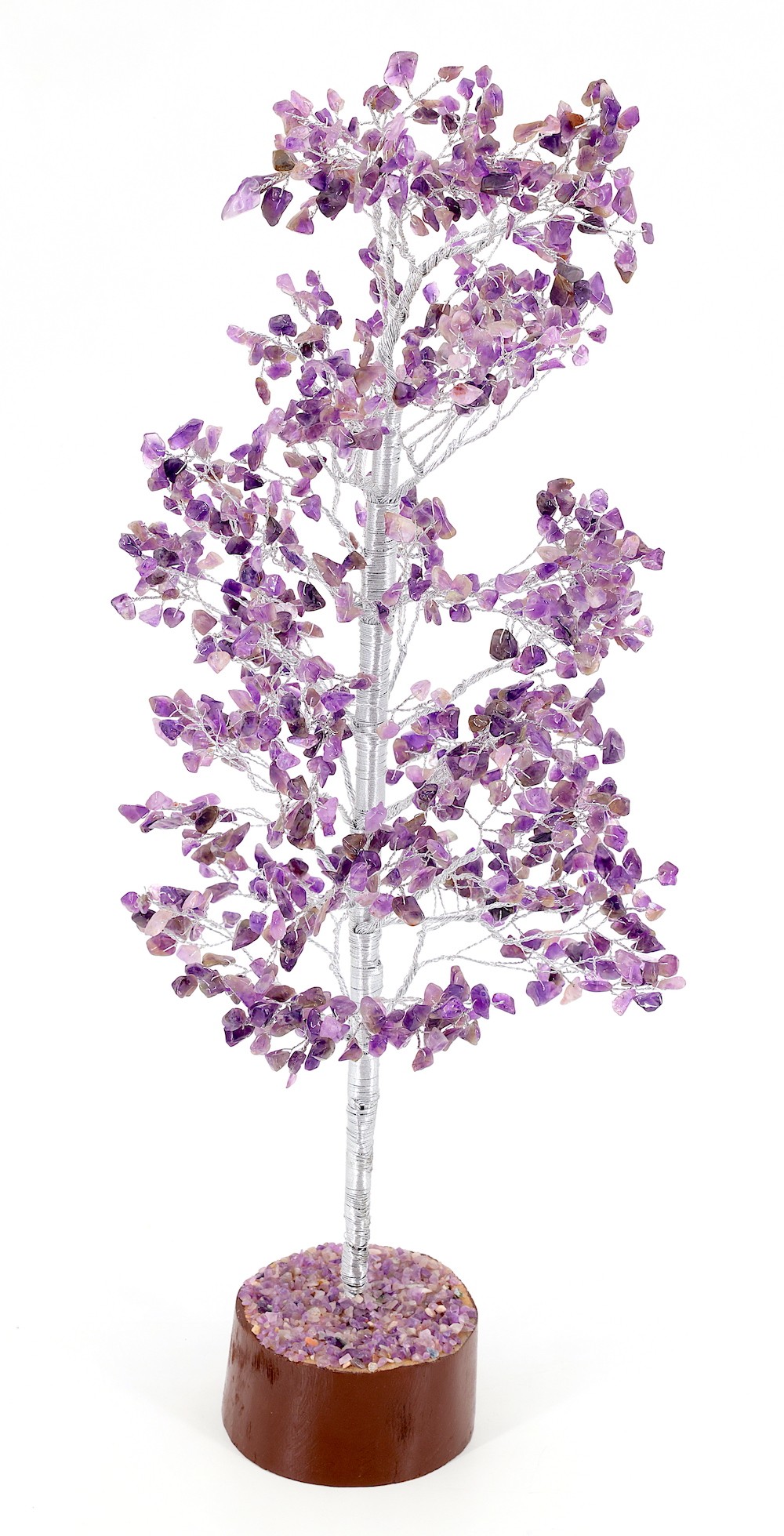 Invite wealth and positivity into your space with this stunning Amethyst and Clear Quartz Gem Tree. Handcrafted with care in Nepal, this Healing Tree of Life is a remarkable Chakra Energy Sculpture that radiates serenity and balance. Expertly crafted by Nepalese artisans, each tree is a testament to traditional craftsmanship and attention to detail. You can tailor the tree's appearance to suit your environment by gently bending the branches to your desired shape. This delicate piece should be handled with care to preserve its intricate design and crystal integrity. While slight variations in height and width may occur, you can expect an accurate and beautifully made item. The tree's colors may differ slightly due to its handmade nature and varying light conditions, ensuring each piece is uniquely beautiful. This Amethyst and Clear Quartz Gem Tree is perfect for anyone looking to infuse their surroundings with positive energy and a touch of elegance.