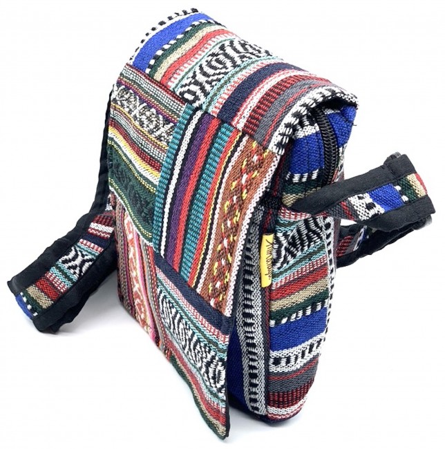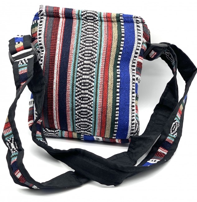 Pure 100% Handwoven Gheri Cotton passport bag is handmade in Nepal. This passport bag has 3 compartment with zippers, in the main compartment it has secret pocket at 8.5-6.5 inches with zippers and it has an adjustable strap at 11-24 inches. Additionally it has 2 pockets the front 6" inch, It is supremely versatile and fashionable. This bag is suitable for carrying passport, mobile phone and mini iPad. It is fair trade product. Could be hand washed or machine washed in cold water.