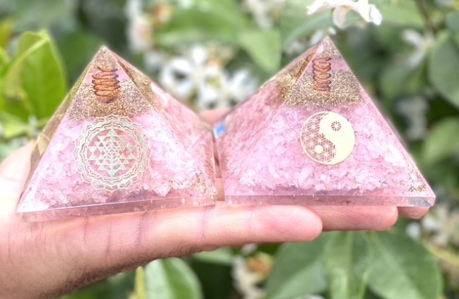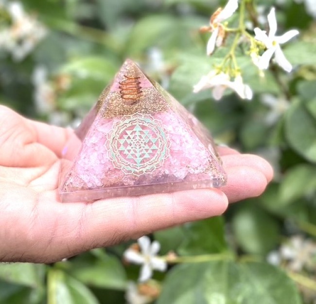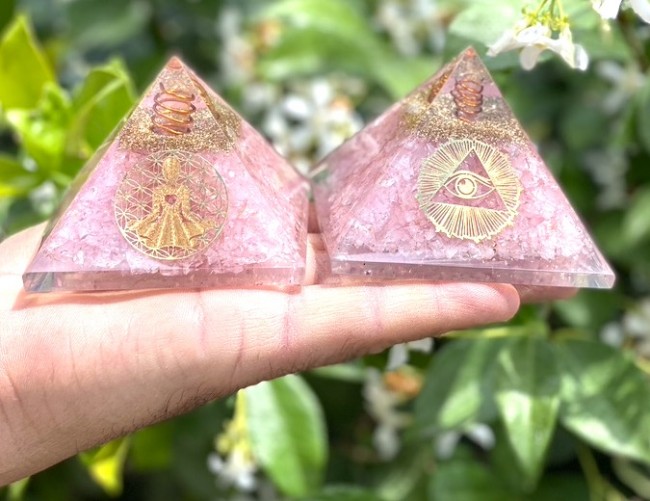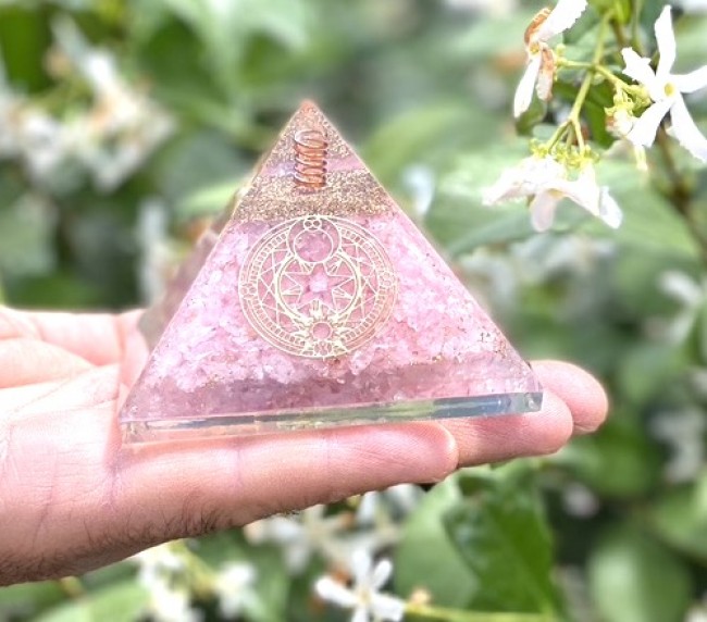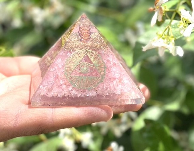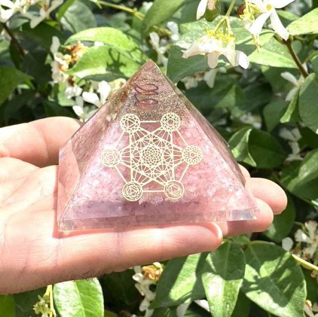 80 MM ROSEQUARTZ PYRAMID WITH TEN DIFFRENT SYMBOL.