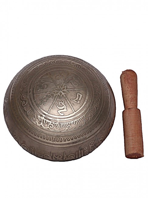 A beautiful authentic machine made singing bowl inscribed with spiritual Tibetan prayers script on the outer wall and it has an enchanting spiritual Tibetan letter design on the outside bottom. In the inner bottom it has a abstract Tibetan Om design etched on. It is made from the combination of seven different metals such as iron, mercury, copper, tin, lead, gold and silver. It gives out a melodious tone when played. The singing bowl creates a relaxing and harmonious sound which is used for yoga, music therapy, to clean the atmosphere around us and sound healing. It comes with free wooden Mallet and Silk cushion.