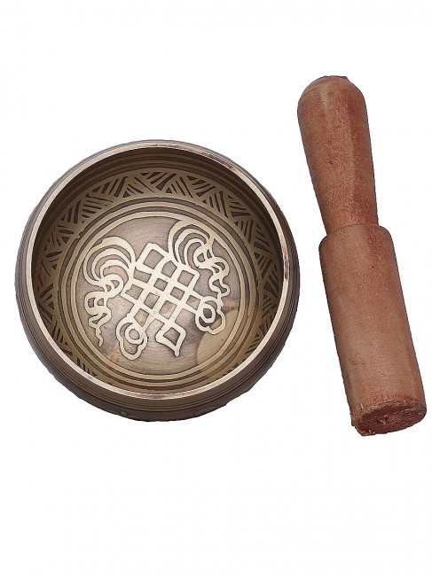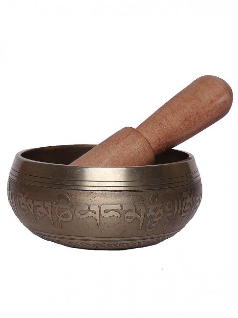 A beautiful authentic machine made singing bowl inscribed with spiritual Tibetan prayers script on the outer wall and it has an embossed Buddha eyes design on the outside bottom. In the inner bottom it has a abstract Tibetan Ashtamangala design etched on. It is made from the combination of seven different metals such as iron, mercury, copper, tin, lead, gold and silver. It gives out a melodious tone when played. The singing bowl creates a relaxing and harmonious sound which is used for yoga, music therapy, to clean the atmosphere around us and sound healing. It comes with free wooden Mallet and Silk cushion.