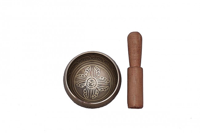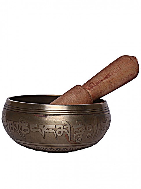 A beautiful authentic machine made singing bowl inscribed with spiritual Tibetan prayers script on the outer wall and it has a abstract Buddha eyes design on the outside bottom. In the inner bottom it has an enchanting symbolic spiritual Tibetan letter etched on. It is made from the combination of seven different metals such as iron, mercury, copper, tin, lead, gold and silver. It gives out a melodious tone when played. The singing bowl creates a relaxing and harmonious sound which is used for yoga, music therapy, to clean the atmosphere around us and sound healing. It comes with free wooden Mallet and Silk cushion.
