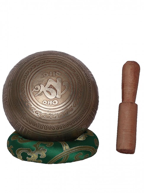 A beautiful authentic machine made singing bowl inscribed with big symbolic spiritual Tibetan letters on the outer wall with other intricate design and it has an enchanting Tibetan letter Om design on the outside bottom. In the inner bottom it has an embossed Bajra design etched on. It is made from the combination of seven different metals such as iron, mercury, copper, tin, lead, gold and silver. It gives out a melodious tone when played. The singing bowl creates a relaxing and harmonious sound which is used for yoga, music therapy, to clean the atmosphere around us and sound healing. It comes with free wooden Mallet and Silk cushion.