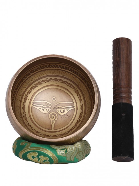 A beautiful authentic machine made singing bowl inscribed with big symbolic spiritual Tibetan letters on the outer wall with other intricate design and it has an enchanting Tibetan letter Om design on the outside bottom. In the inner bottom it has an embossed Buddha eyes design etched on. It is made from the combination of seven different metals such as iron, mercury, copper, tin, lead, gold and silver. It gives out a melodious tone when played. The singing bowl creates a relaxing and harmonious sound which is used for yoga, music therapy, to clean the atmosphere around us and sound healing. It comes with free wooden Mallet and Silk cushion.