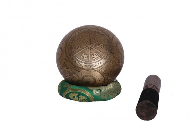 A beautiful authentic machine made singing bowl inscribed with big symbolic spiritual Tibetan letters on the outer wall with other intricate design and it has an enchanting Spiritual Tibetan letter on the outside bottom. The inner bottom has abstract Sankha design etched on. It is made from the combination of seven different metals such as iron, mercury, copper, tin, lead, gold and silver. The singing bowl creates a relaxing and harmonious sound which is used for yoga, music therapy, to clean the atmosphere around us and sound healing. It comes with free wooden Mallet and Silk cushion.