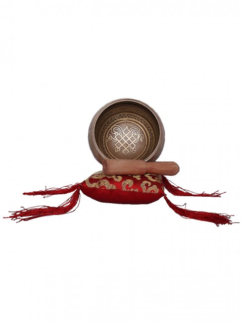 A beautiful authentic machine made singing bowl inscribed with big symbolic spiritual Tibetan letters on the outer wall with other intricate design and it has an embossed Tibetan letter Om on the outside bottom. The inner bottom has enchanting spiritual Tibetan Ashtamangala design etched on. It is made from the combination of seven different metals such as iron, mercury, copper, tin, lead, gold and silver. The singing bowl creates a relaxing and harmonious sound which is used for yoga, music therapy, to clean the atmosphere around us and sound healing. It comes with free wooden Mallet and Silk cushion.