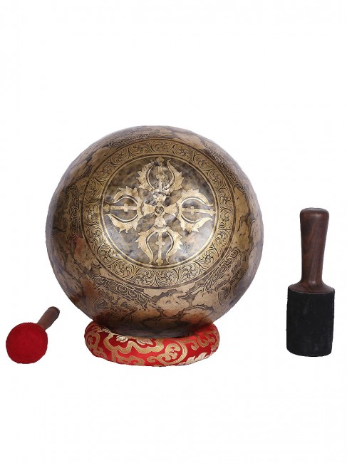 A beautiful inscribed hand crafted singing bowl with intricate five Buddha design around the outer wall also it’s embossed with other intricate design on outside and it has abstract Bajra design on the outside bottom. The inner bottom has intricate Buddha feet design etched on. It is made from the combination of seven different metals. The singing bowl produces a relaxing and harmonious sound which is used for yoga, music therapy, to clean the atmosphere around us and sound healing. It comes with free wooden Mallet and Silk cushion.