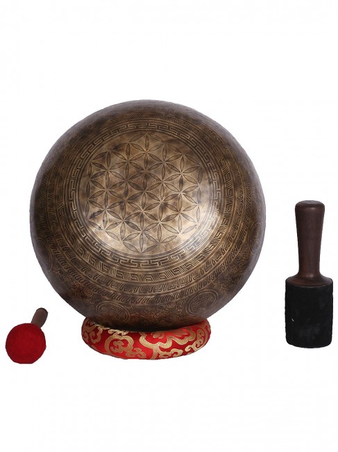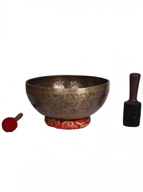 A beautiful inscribed hand crafted singing bowl with an embossed intricate design around the outer wall and it has an enchanting Tibetan design on the outside bottom. The inner bottom has intricate design with symbolic Tibetan letter etched on. It is made from the combination of seven different metals. The singing bowl produces a relaxing and harmonious sound which is used for yoga, music therapy, to clean the atmosphere around us, religious ceremonies and sound healing. It comes with free wooden Mallet and Silk cushion.