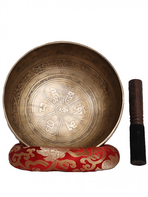 A beautiful inscribed hand crafted singing bowl with Tibetan prayer scripted symbols around the outer wall also it’s embossed with other intricate design on outside and it has abstract Bajra design on the outside bottom. The inner bottom has an enchanting Tibetan letter design etched on. It is made from the combination of seven different metals. The singing bowl produces a relaxing and harmonious sound which is used for yoga, music therapy, to clean the atmosphere around us and sound healing. It comes with free wooden Mallet and Silk cushion.